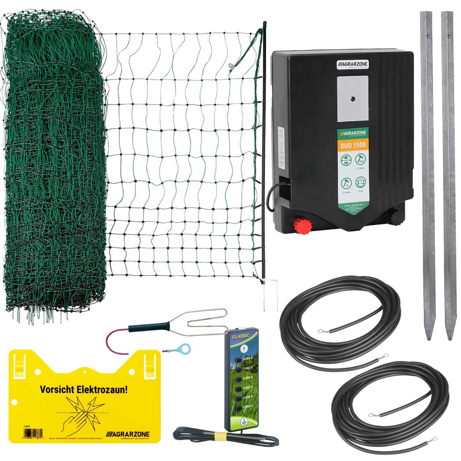 Le kit complet comprend l'électrificateur DUO 1500, qui a été spécialement conçue pour assurer une défense efficace contre les animaux sauvages et les prédateurs des étangs. La clôture peut fonctionner de manière très flexible, soit sur secteur de 230V, soit sur une batterie AGM de 12V (non incluse). Équipé d'une LED de contrôle des fonctions, vous avez toujours en vue la fonction de l'appareil et la tension de la clôture. Le kit comprend également un filet électrique à mailles serrées de 50m de long et 65cm de haut, doté d'une double pointe stable. La pointe double tient très bien dans les sols terreux. Des ancrages de sol fermes, des bouchons de sol et un fil de terre renforcé ne transportant pas de courant garantissent une position ferme et un flux de courant optimal permanent. Avec les autres accessoires tels que la tige de mise à la terre, le câble de raccordement à la terre et à la clôture, le panneau d'avertissement, etc., vous avez tout ce dont vous avez besoin pour une installation rapide de votre clôture électrique.