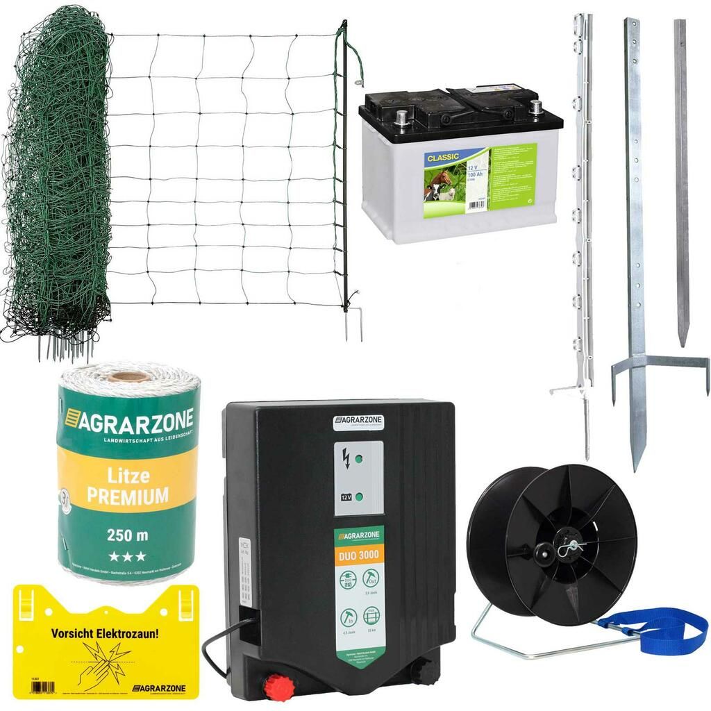 Kit de défense Agrarzone pour moutons & électrificateur DUO 3000 12V/230V, 4,5J, filet 500m x 90cm + fil 1000m