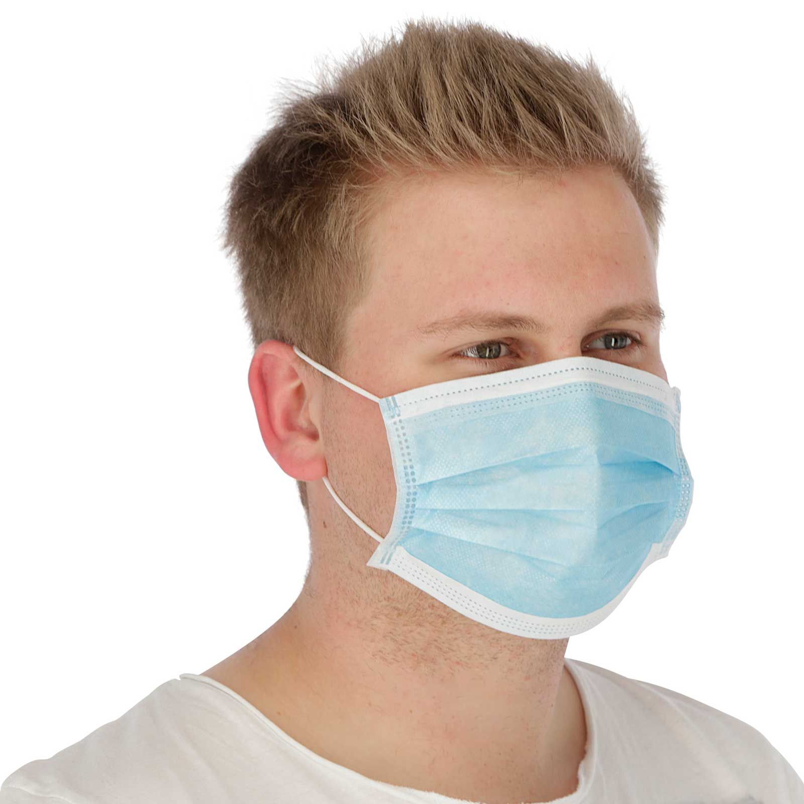 Le masque d'hygiène classique protège contre les grosses poussières et l'environnement est protégé contre les plus grosses gouttelettes. Les plus grosses gouttelettes (> 5 µm) volent le plus loin (max. 1,5 m). Grâce aux cordons de fixation des oreilles flexiréglables en charge, ce masque facial est confortable et son maintien est garanti