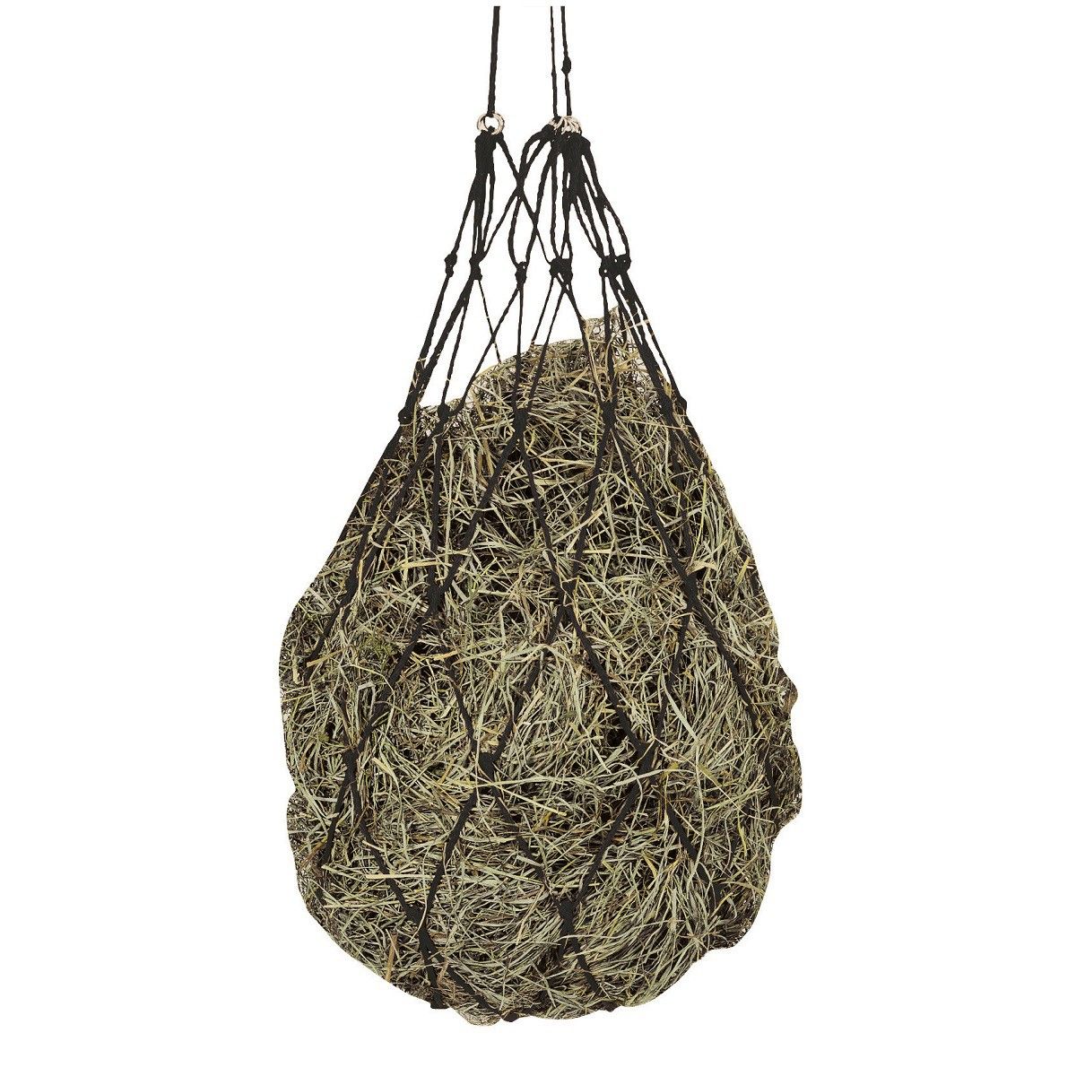 Suspendez toujours le filet à foin à proximité du sol afin qu'il puisse adopter une position d'alimentation naturelle. Le filet à foin est livré avec des anneaux de suspension.
