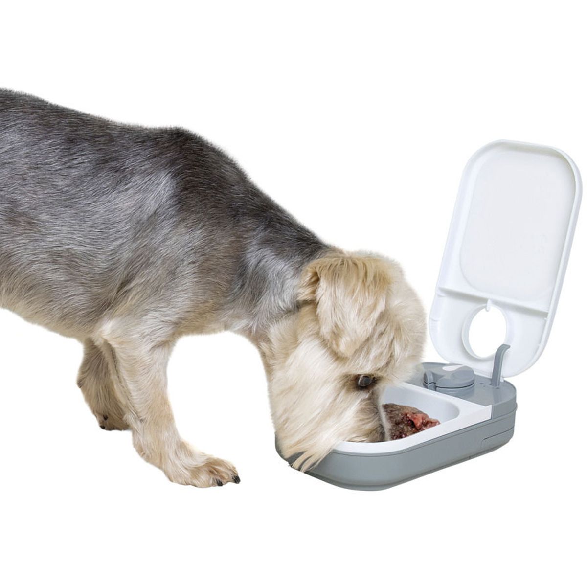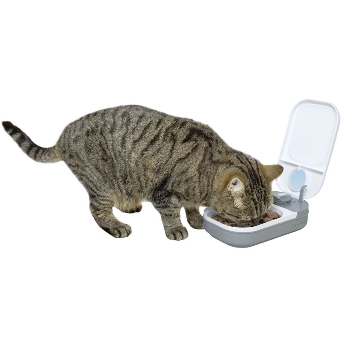 The Cat Mate C100 pet feeder serves 1 meal to a cat, kitten, or small dog when you are away during the day, evening, or weekend. The food stays fresh under a tightly closing lid. Simply set the time switch to the desired time delay (up to a maximum of 24 hours) to let the lid open at the desired time.