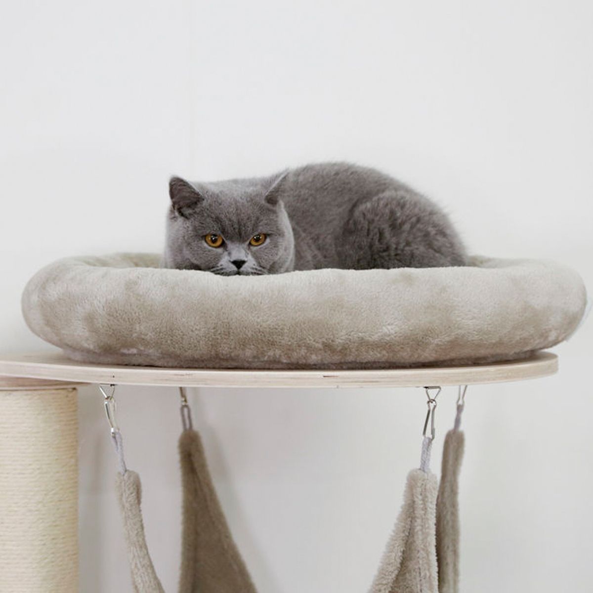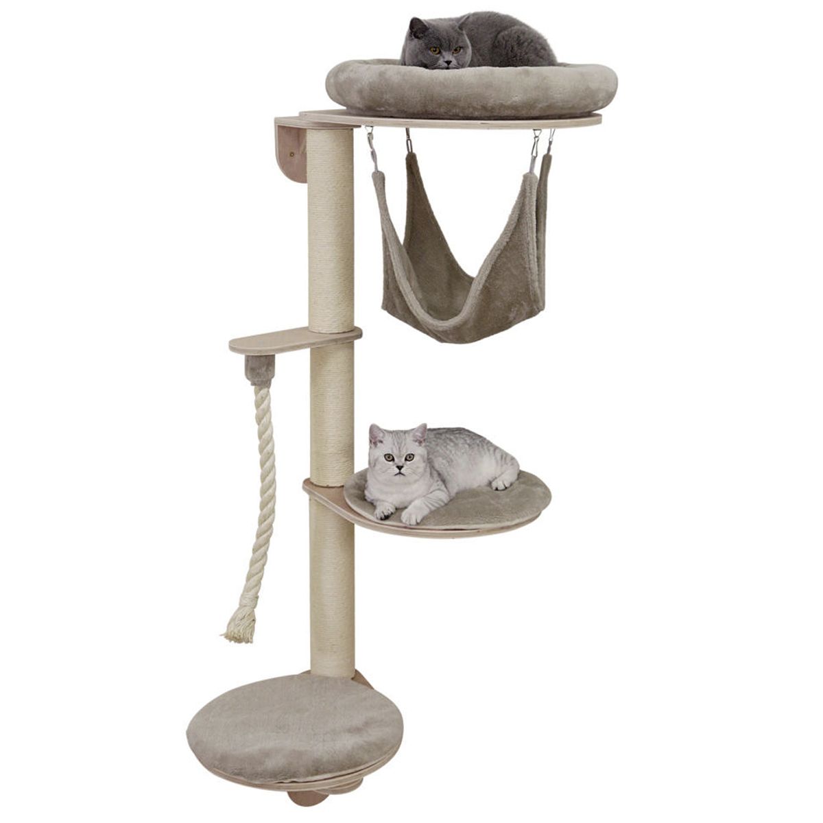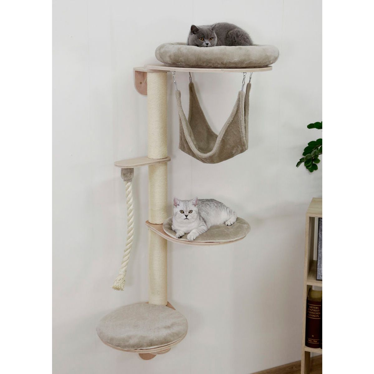 Un griffoir mural moderne pour les chats avec hamac, bûches de sisal, corde à jouer et plate-forme avec lit en peluche - pour jouer, s'ébattre et se détendre.