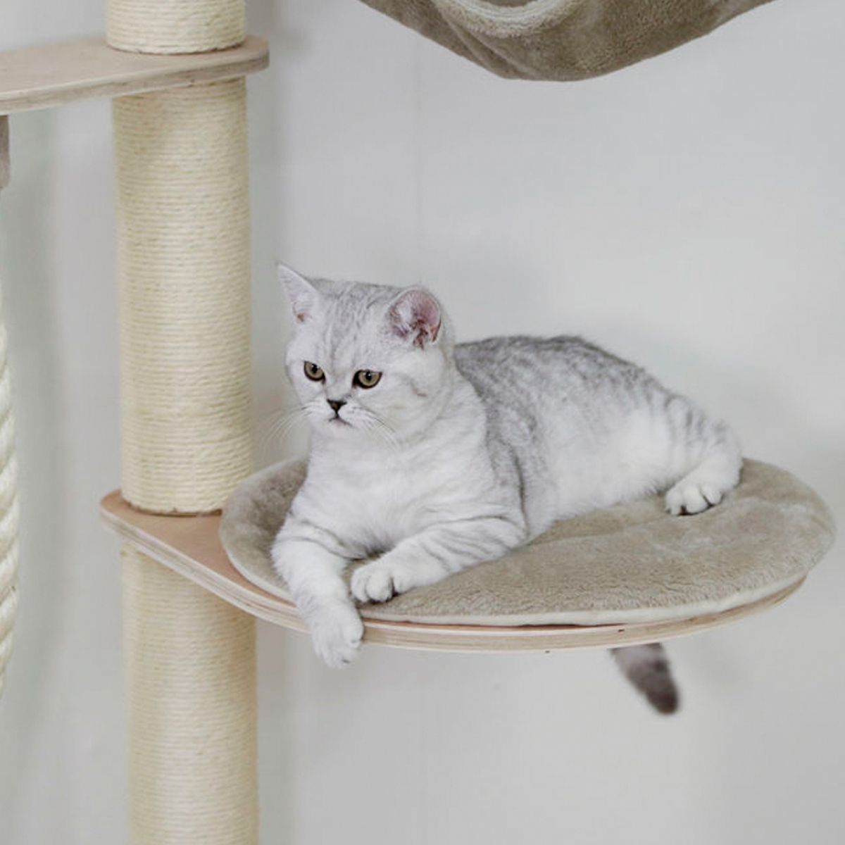 L'arbre de grattage créatif des murs est composé de plusieurs éléments. En plus de trois troncs de sisal longs et épais, ils comprennent deux espaces de détente, un hamac confortable et une plate-forme d'observation avec un lit en peluche. Les oreillers sont amovibles et lavables à 30°c.