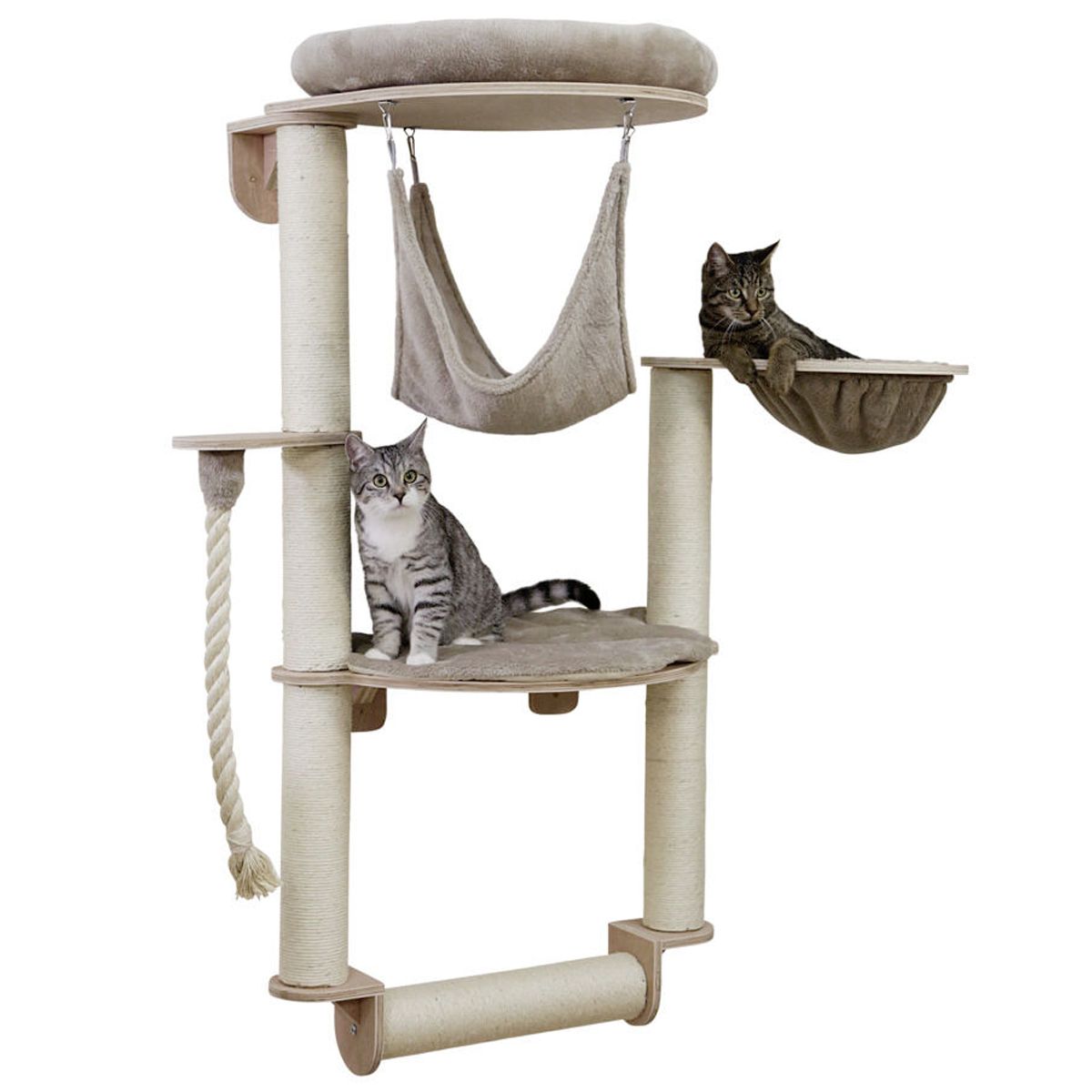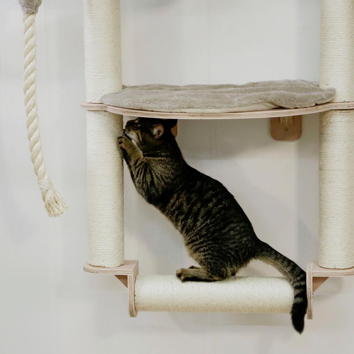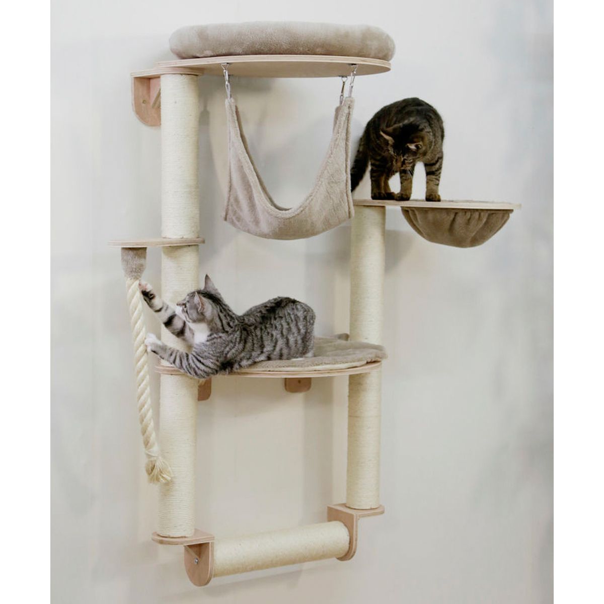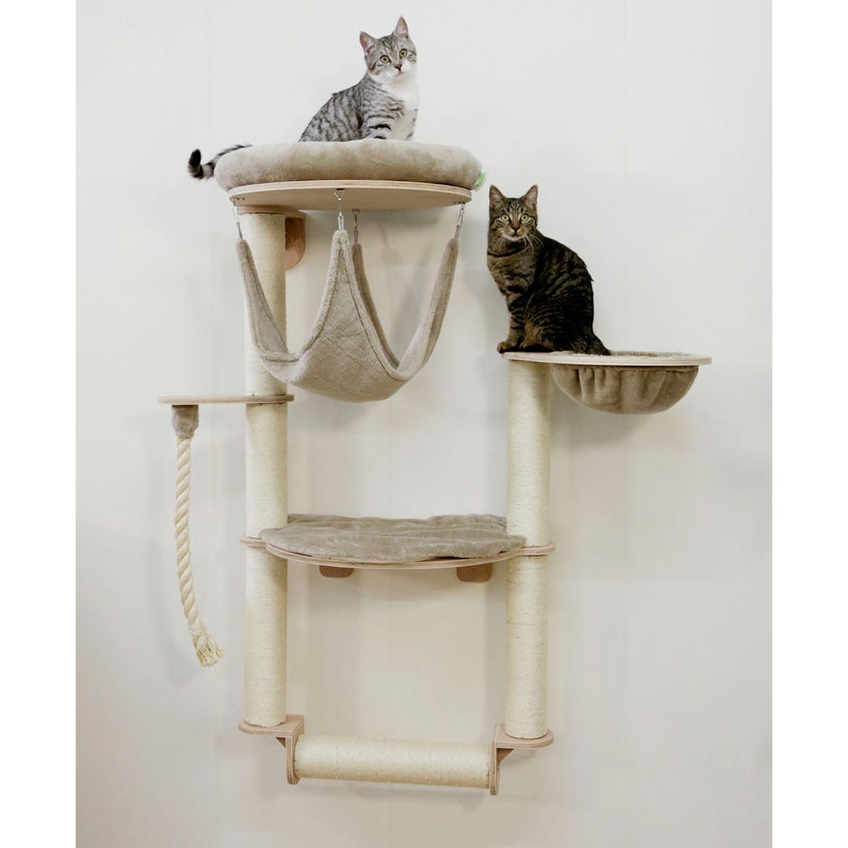 Un griffoir mural moderne pour les chats, avec hamac, canapé, malles en sisal, corde à jouer et plate-forme avec lit pour les câlins - pour jouer, s'ébattre et se détendre.