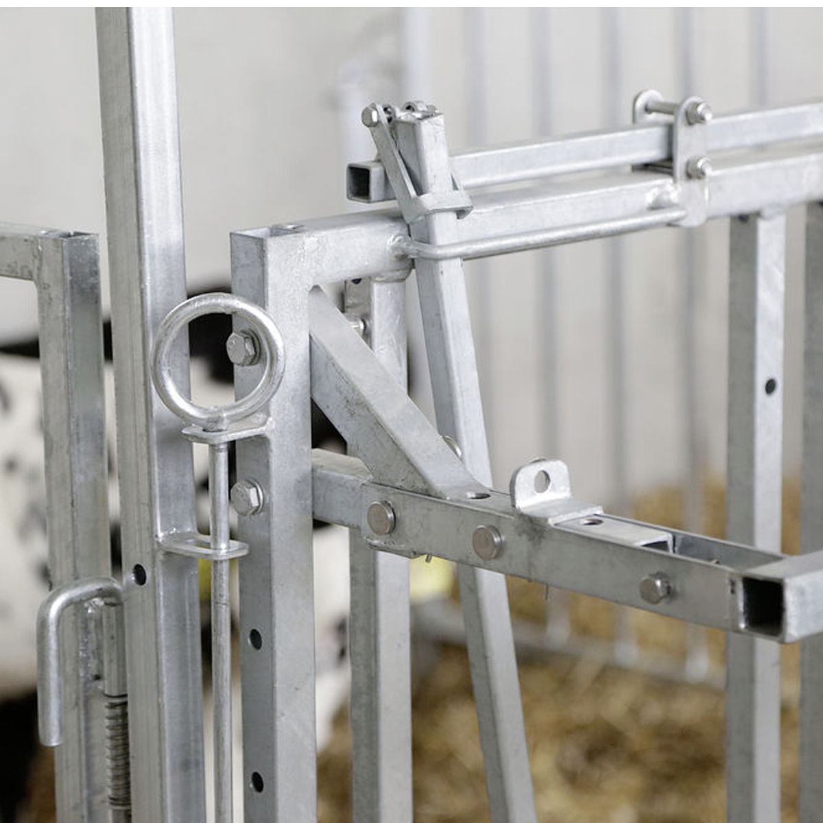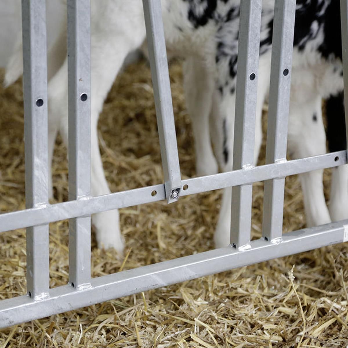 Pour garder les veaux dans un pavillon ou un espace couvert, la clôture peut être facilement fixée au mur à l'aide d'un support mural. La clôture peut également être ancrée au sol. La clôture peut être assemblée individuellement selon les besoins.