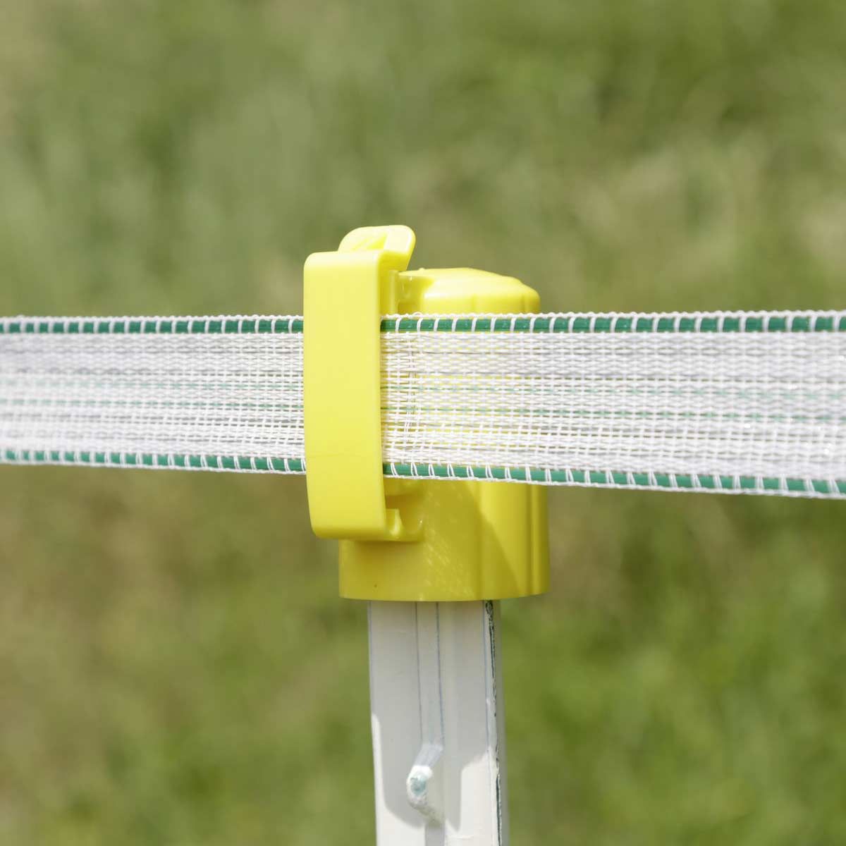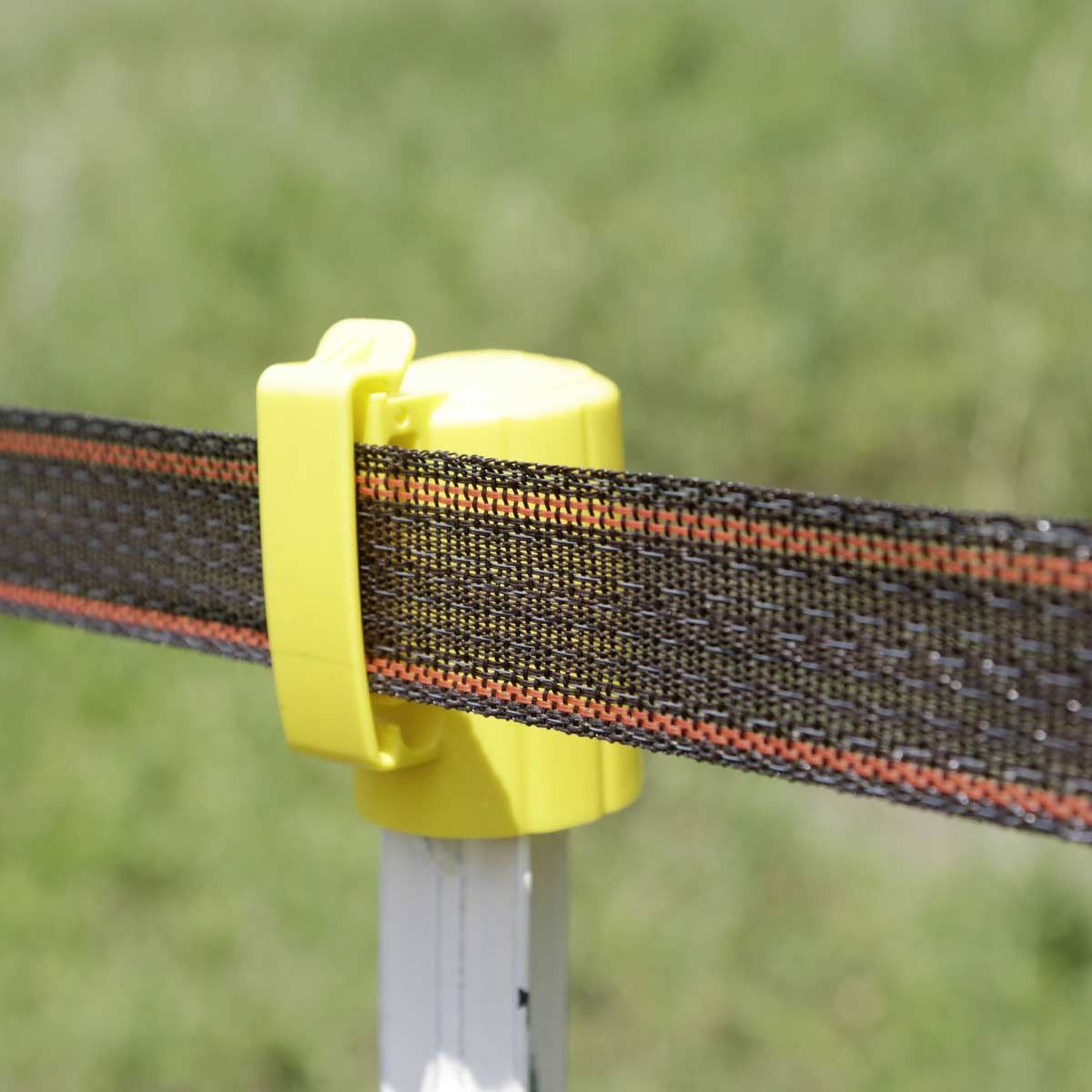 les poteaux t-Post ont des arêtes d'angle assez vives en raison du profil t du sommet du poteau. Avec un isolateur de tête, vous pouvez ainsi protéger vos animauxefficacement protégés contre les blessures. Un autre avantage de l'utilisation d'un isolateur de tête de poteau en T est que vous pouvez la hauteur totale d'un poteau en T pour ajouter une rangée supplémentaire de les isolateurs de tête robustes et durables peuvent recevoir du ruban de clôture jusqu'à 40 mm, du fil de clôture jusqu'à 8 mm et des torons. Le fonction de clip supplémentaire la fonction de clip supplémentaire de l'isolateur du poteau en T permet de fixer le ruban de clôture de manière permanente et d'empêcher son explosion. L'isolateur de tête Premium tient bien en place grâce à la conception améliorée avec post encore plus en sécurité sur le t-Post. Il est composé de plastique résistant aux chocs et aux UV et donc assez durable et stable. Il est très facile de l'attacher à un poste de travail Placez l'isolant sur le haut du poteau, faites passer le matériau conducteur, fermez le clip - c'est fait L'isolateur du poteau T est disponible en noir classique ou en jaune, la couleur de signalisation la plus visible. En raison de la couleur jaune signal cet isolateur de tête dispose d'une effet dissuasif.