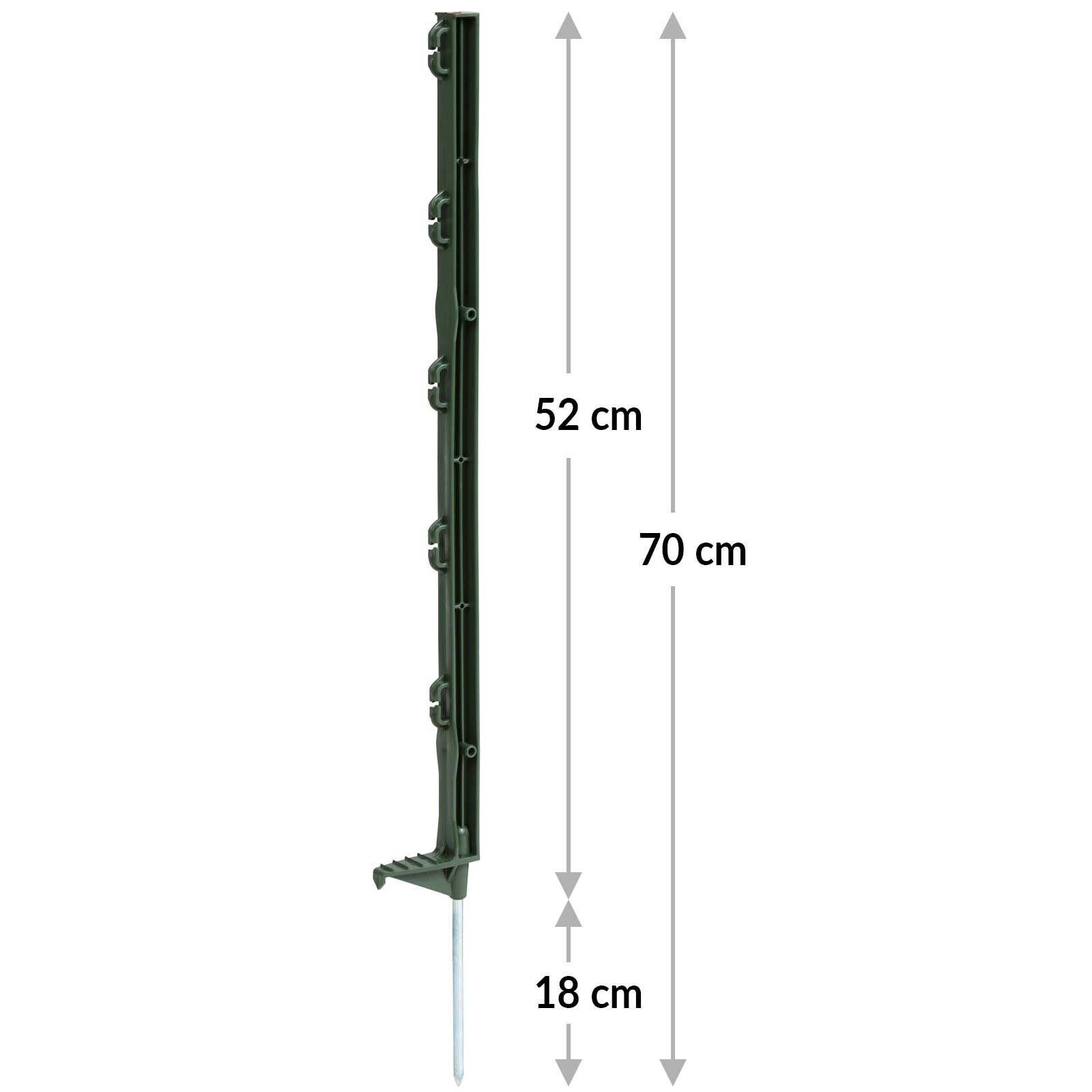 Le piquet de clôture pour pâturage dispose de 5 œillets de ruban (2 cm) et a une longueur totale de 70 cm, dont 52 cm au-dessus du sol. Cette combinaison de taille compacte et de grande stabilité fait du piquet de clôture pour pâturage un produit fiable pour toutes les exigences en matière de protection contre la faune sauvage et de clôtures pour petits animaux.