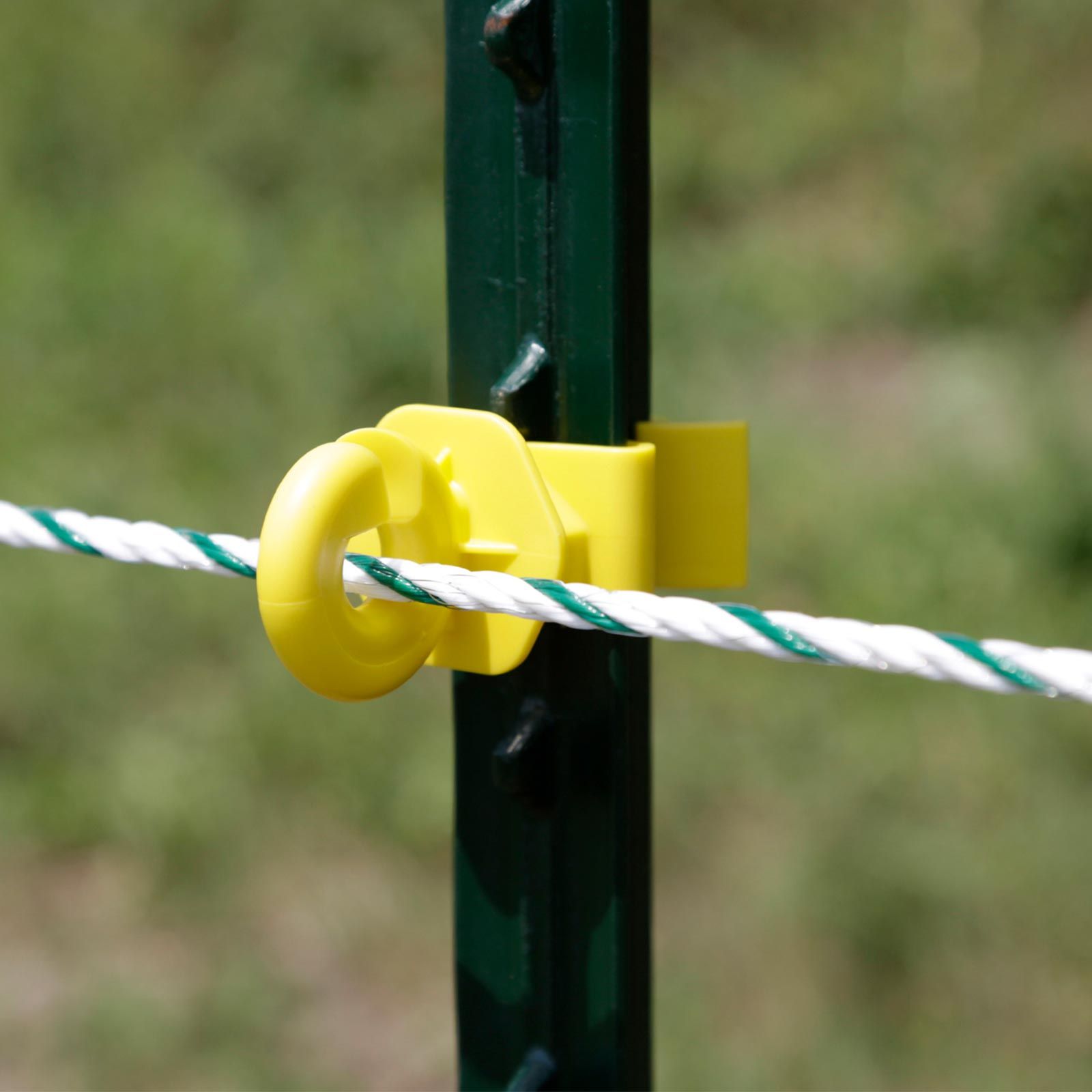 Le Isolateur de poste T convient pour fixer des fils, torons et rope jusqu'à 6 mm et du ruban adhésif jusqu'à 10mm de large sur le poteau en T. Faites passer le matériau conducteur à travers la tête de l'isolateur sans aucun outil et resserrez le matériau conducteur selon les besoins. Grâce aux très bonnes propriétés d'isolation de l'isolant annulaire, les pertes de tension du matériau conducteur vers le poteau en T sont évitées et votre clôture reste plus sûre. Cet isolateur annulaire très robuste convient à tous les systèmes de poteaux en T et de clôtures fixes. L'isolateur de la clôture de pâturage est simplement fixé au poteau en T à la hauteur souhaitée. Le T-Post a des plots solides tous les 5,5 cm sur toute sa longueur pour fixer les accessoires du T-Post.