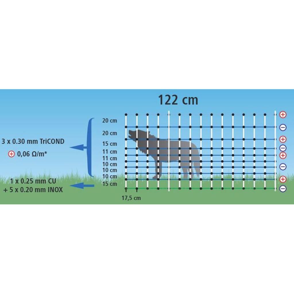 (incl. : 1x module solaire monocristallin fixe 25 Watt, 1x piquet de terre/montage en deux parties, 1x batterie AGM 12 V, 1x câble de connexion à la clôture, 1x câble de mise à la terre) - 8x Filet anti-loup Maxi 50m, 122cm, double pointe, blanc, électrifiable