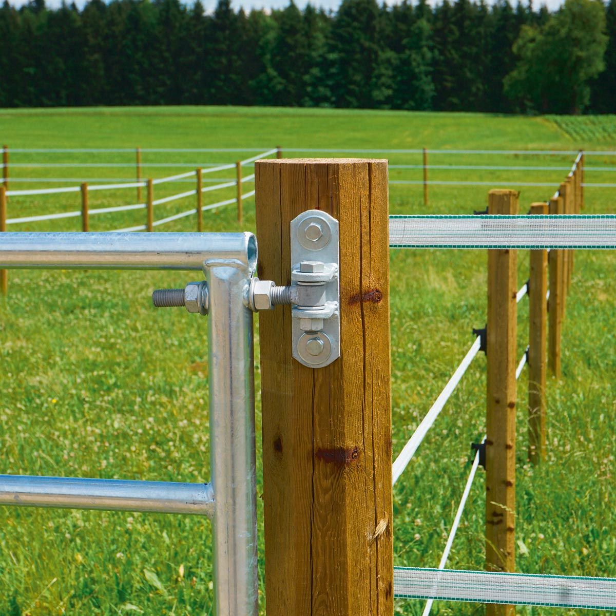 Un verrou automatique à enclenchement empêche l'ouverture involontaire du portail de clôture et contribue à empêcher les animaux de s'échapper. Avec un cadenas en option, vous pouvez sécuriser davantage le verrou de la porte galvanisée. Pour une protection encore plus efficace des troupeaux, l'accès à la clôture du pâturage peut être électrifié avec notre kit de clôture électrique pour portes de pâturage. Cela empêche efficacement les animaux d'entrer en contact avec la barrière de clôture électrique ou de l'endommager. Malgré l'électrification, la barrière de pâturage électronique peut être facilement ouverte à la main sans risque de choc électrique.
