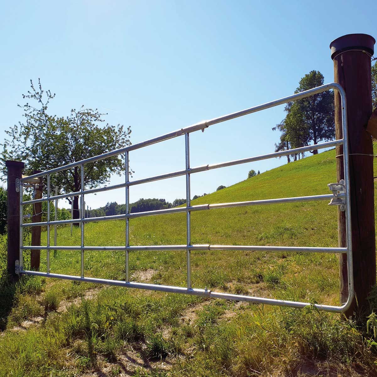 Remarque: Nos barrières d'herbage en acier pour chevaux et bovins sont installées sur le pâturage ou dans l'écurie de manière à ce que les portes s'ouvrent vers l'intérieur. Ainsi, en plus d'une sécurité supplémentaire pour le troupeau, un accès simple et réglable au pâturage est possible. À partir de 3 m de long, vous pouvez faire passer en toute sécurité un tracteur dans le pâturage ou le bétail et les chevaux sans effort.