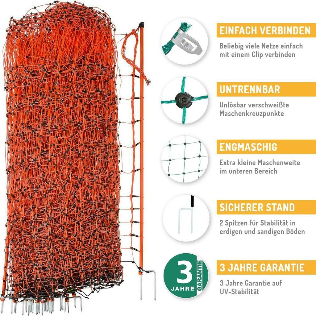 La livraison comprend un filet à moutons orange de 50m, très visible, d'une hauteur de 90cm, maintenu par 14 piquets en plastique à double pointe. Cette double pointe offre plus de stabilité dans les sols terreux et sablonneux qu'une pointe simple. Sur les neufs fils de plastique, les huits premiers sont électrifiés. Le fil inférieur n'est pas sous tension afin de ne pas interrompre le flux de courant à travers les herbes. Le filet pour moutons a des mailles particulièrement étroites qui rendent la fuite de vos moutons encore plus difficile. Si nécessaire, vous pouvez facilement étendre le filet de pâturage avec d'autres filets. Le flux de courant optimal est également assuré lorsque plusieurs filets électriques sont tendus ensemble jusqu'à une longueur maximale d'environ 600m (sans végétation).