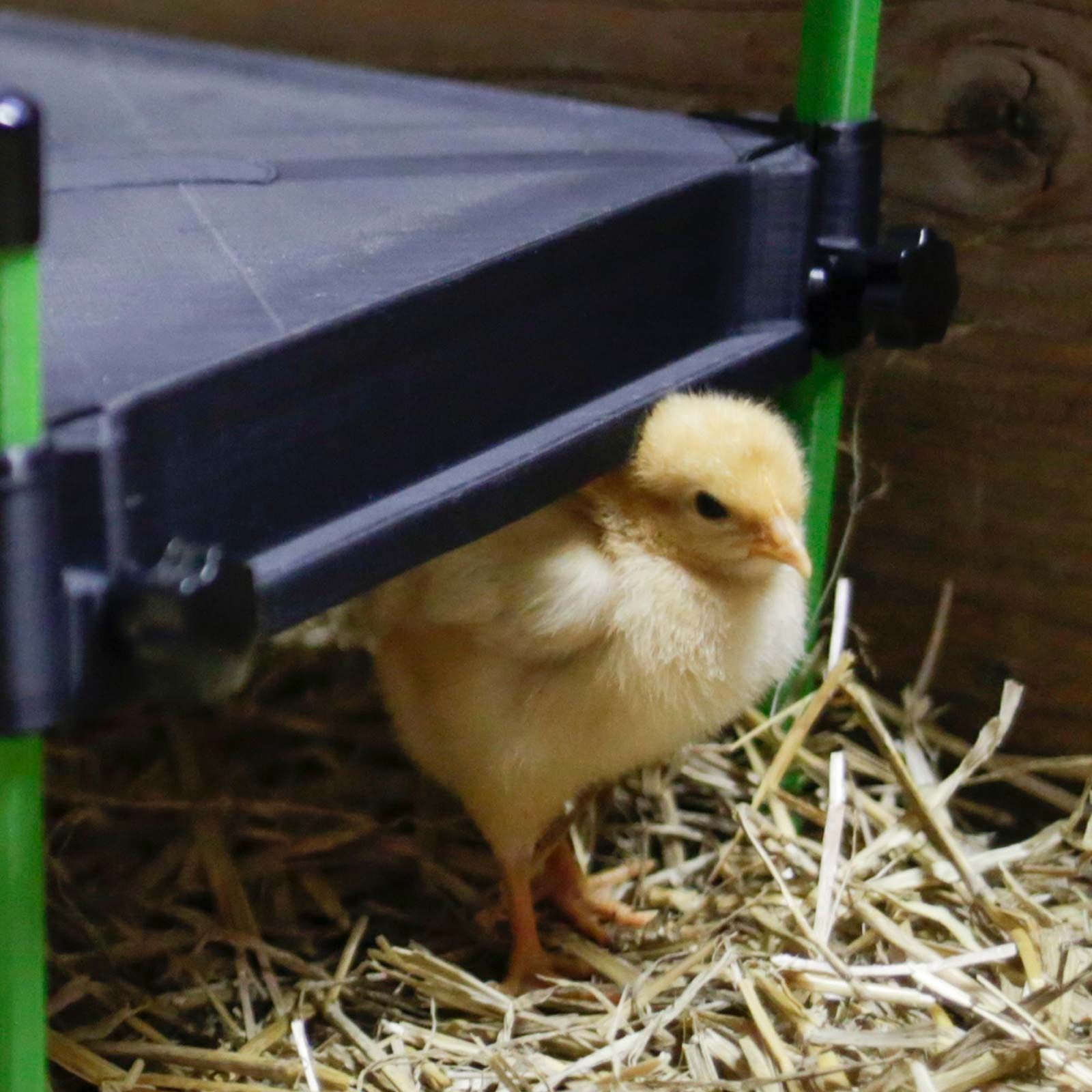 Dans la nature, les poussins se tiennent au chaud et s'abritent sous la poule. Cependant, de nombreux éleveurs amateurs et professionnels utilisent des couveuses pour l'éclosion, ce qui signifie que les poussins à l'éclosion ont besoin d'une autre source de chaleur que la mère poule. Une poule artificielle équipée d'une plaque chauffante est la solution idéale à cet effet. Les jeunes poussins apprendront rapidement à trouver un abri et de la chaleur sous la plaque chauffante, et leur croissance se fera de manière appropriée. La particularité qui différencie la plaque chauffante des lampes chauffantes normales est également son panneau, qui reproduit les conditions d'une vraie poule. Cela est également dû au fait que le produit n'émet pas de lumière. Les animaux ne seront donc pas stressés par le fait d'être éclairés par une lumière artificielle et s'habitueront plus rapidement aux rythmes biologiques du jour et de la nuit.