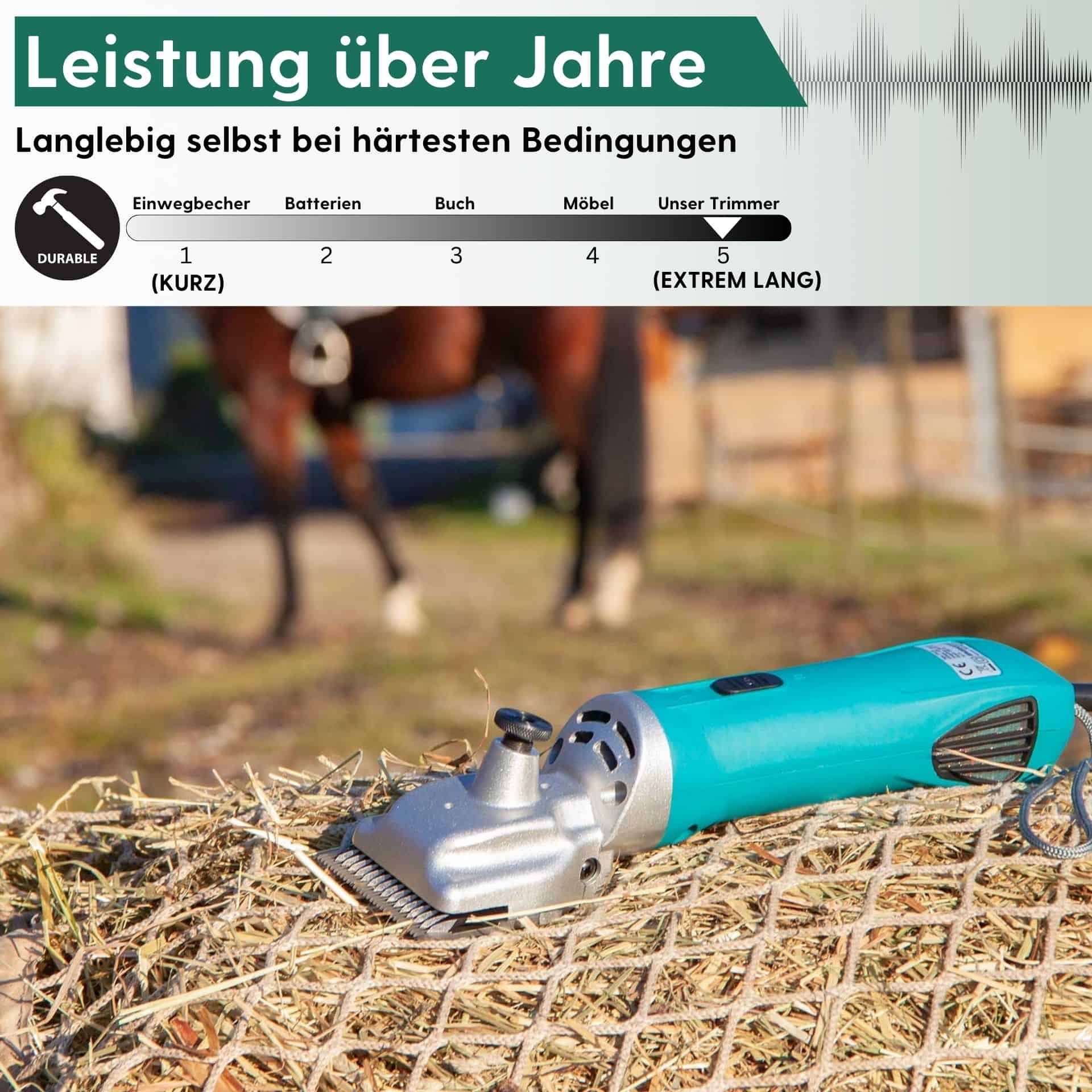 Unsere wesentlich teurere Marken-Schermaschine hat bei unserem Cushing-Pony völlig versagt. Von von einer Fachfrau bei einem Schermesserschleifer und -Anbieter wurde mir gesagt, dass es bei Cushing-Ponys keine gut geeignete Pferdeschermaschine gäbe, ich solle auf eine Spezialmaschine für lockige Rinder ausweichen. Aber bei der Google-Suche mit Eingabe Cushing-Ponys wurde mir zum Glück diese preiswerte, robuste Schermaschine angezeigt, mit der ich unserem mittlerweile 30-jährigen Pony das Leben sehr erleichtern kann. Genügend Schermesser braucht man, mindestens einen weiteren Satz würde ich empfehlen. Super Produkt!