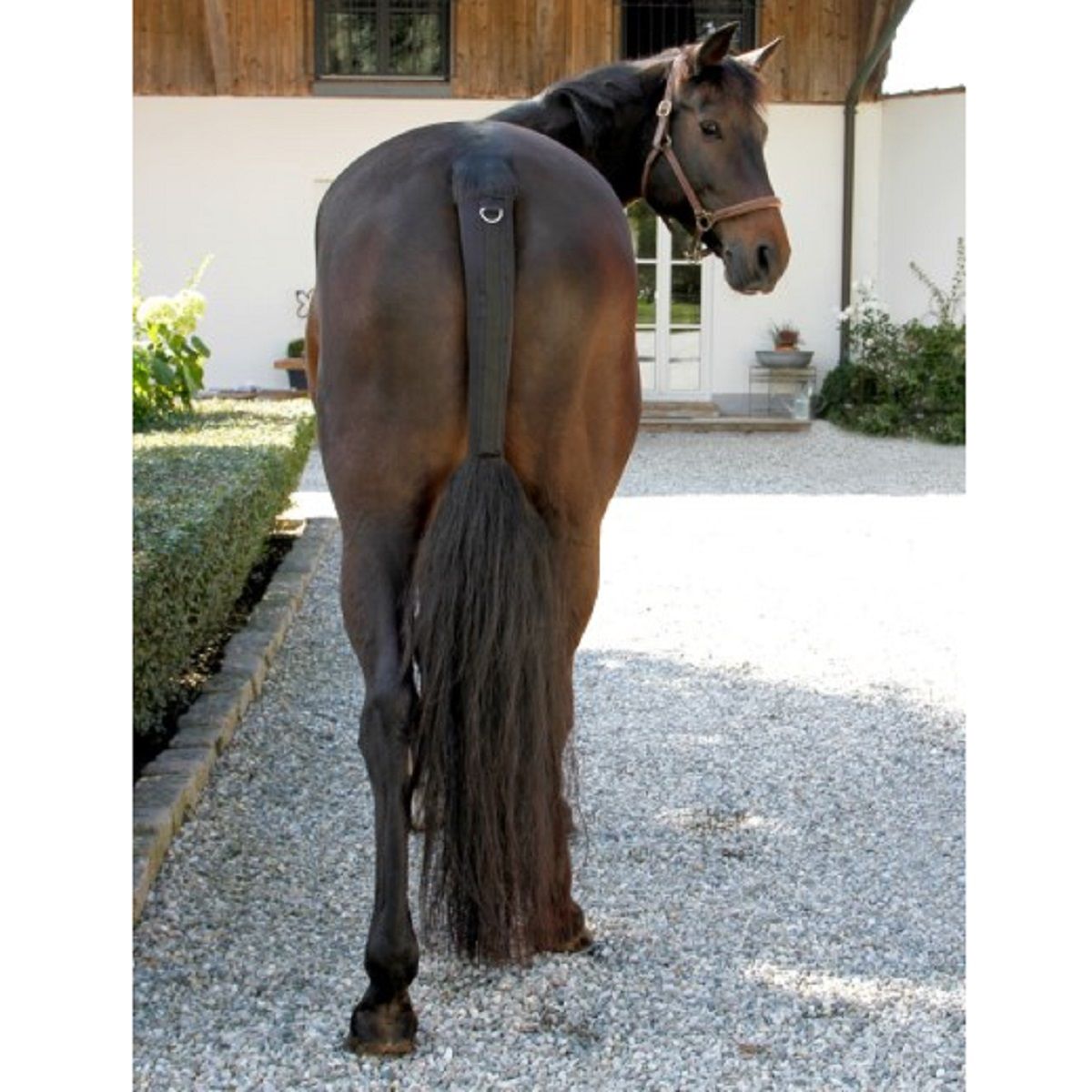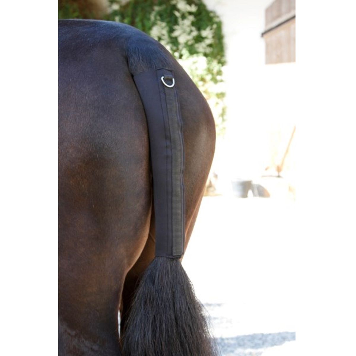 Le protège-queue en caoutchouc synthétique élastique est idéal pour le transport de chevaux dans une remorque. Le protège-queue protège parfaitement la queue du cheval. Le matériau à la fois solide et souple offre en outre un confort agréable à votre cheval. Grâce à la fermeture velcro, le protège-queue pour chevaux est facile à mettre en place. Il est important que la protection ne soit pas trop lâche, ce qui empêche le protège-queue de glisser. Le protège-queue est équipé d'un anneau métallique qui permet de l'attacher à la couverture de transport.