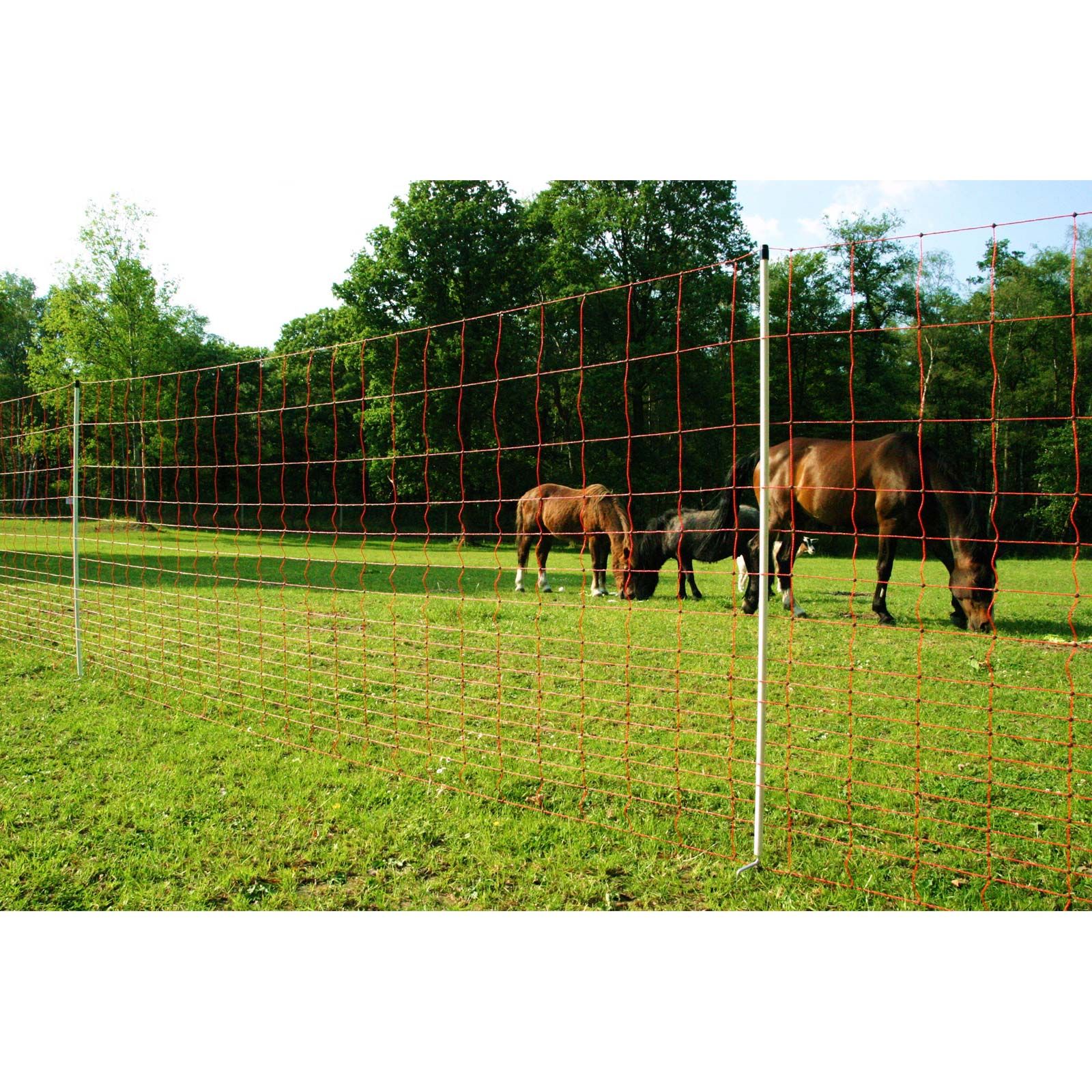 Le solide filet de clôture électrique électrifiable de 145 cm de haut permet de garder les chevaux et autres animaux tels que les ânes, les chèvres, les moutons, les bovins, etc. Les 15 piquets jumbo stables inclus ont un diamètre de 19 mm et sont équipés d'une double pointe. La double pointe permet au filet de rester stable même dans des conditions de sol difficiles. Les piquets empêchent efficacement le filet de s'affaisser. La couleur orange passe difficilement inaperçue, ce qui améliore encore la sécurité de la garde.
