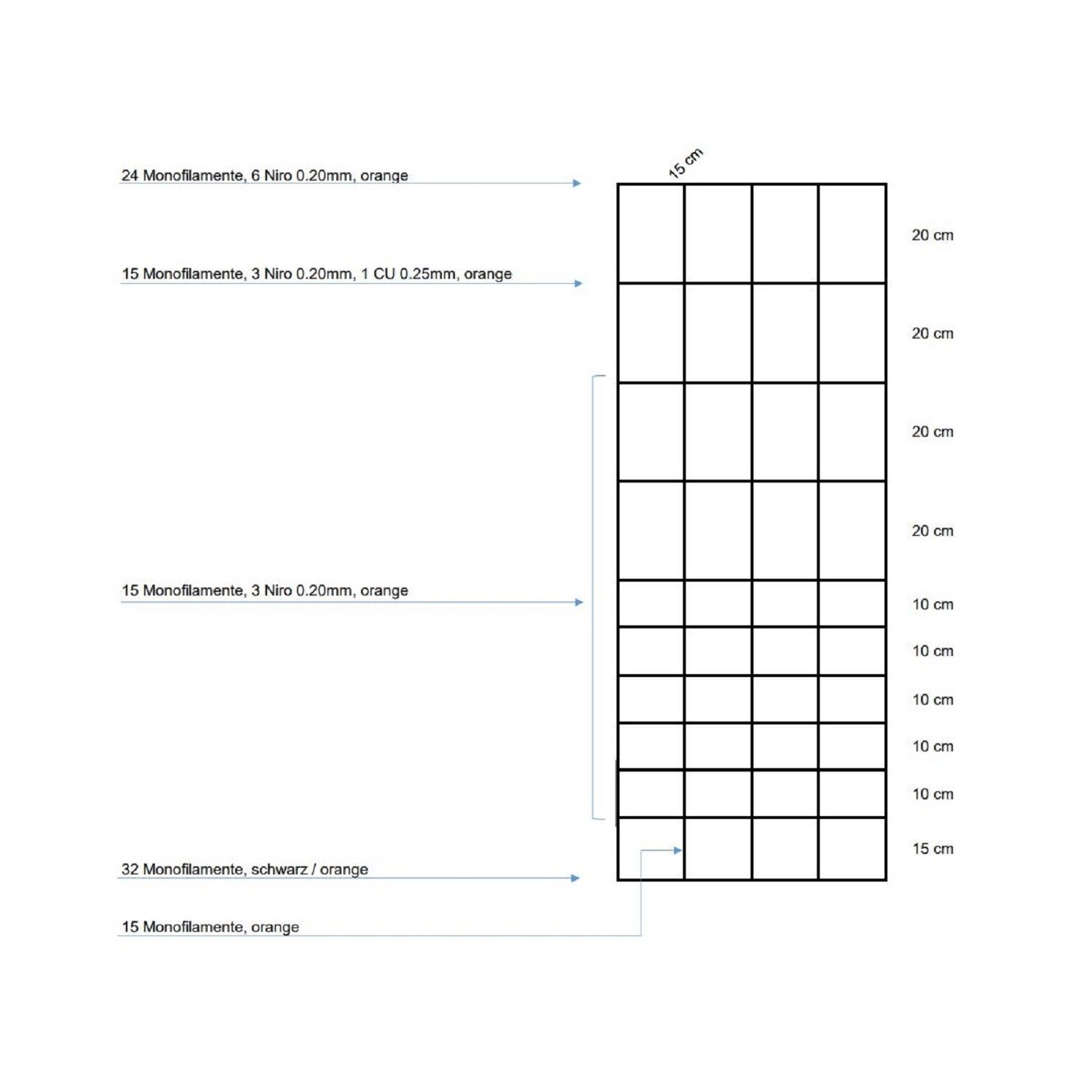 - 11 fils horizontaux, dont 10 avec fil de nickel chromé incorporé (3 Niro 0,20 mm, fil supérieur: 6 Niro)