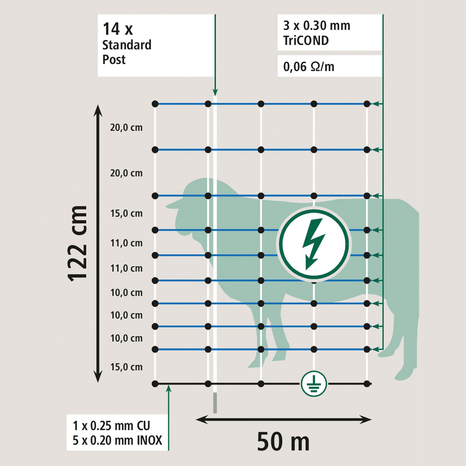 Le nouveau filet anti-loups AKO OviNet MAXI, entièrement révisé, est le compromis parfait entre la facilité d'utilisation et la protection efficace du troupeau et des animaux de pâturage. Équipé de 9 rangées de matériau conducteur TriCond de 3 x 0,30 mm chacune, le filet garantit une conductivité optimale. Grâce au principe +/-, dans lequel les conducteurs sont reliés alternativement à la connexion de la clôture et à la connexion de la terre, le filet anti-loup électrifiable OviNet MAXI garantit des impulsions électriques plus intenses et un effet dissuasif plus important. L'utilisation de piquets en plastique blanc avec une pointe galvanisée assure la grande stabilité du filet même dans les installations sur des terrains vallonnés et irréguliers. Les nœuds de jonction sont soudés et extrêmement solides. Le filet OviNet MAXI est également équipé d'un fil de terre renforcé, qui peut être connecté en option pour une mise à la terre sur toute la longueur du filet en cas de conditions de sol défavorables (par exemple, un sol très sableux ou sec). Les fils en plastique sont garantis pendant 3 ans contre les dommages causés par les UV.