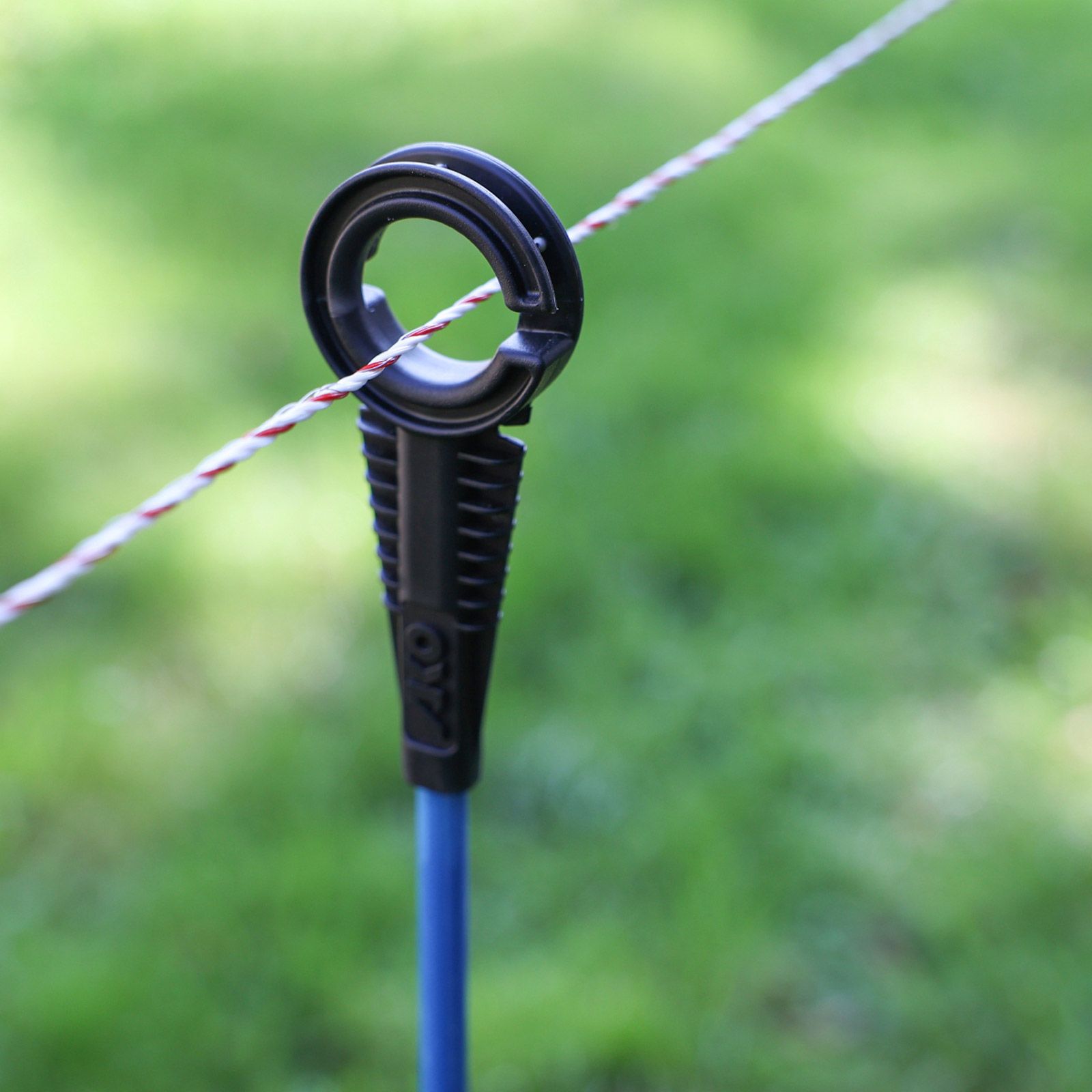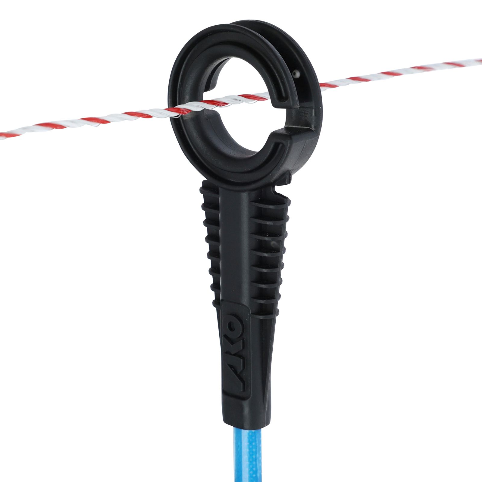 Les piquets en fibre de verre AKO Oval Premium Blue séduisent par leur légèreté et leur volume, ainsi que par leur incroyable durabilité, stabilité et maniabilité. Les nouveaux piquets avec un revêtement innovant en polyester non tissé ont une résistance aux UV nettement supérieure à celle des piquets en fibre de verre traditionnels et une surface absolument lisse qui ne laisse pas de résidus de fibre de verre désagréables sur la peau. Ces piquets présentent un autre avantage de taille : ils sont légers et très maniables. Il est ainsi très facile de transporter quelques douzaines de pâturages mobiles et de les « planter » beaucoup plus rapidement que jamais auparavant. C'est parfait si vous déplacez souvent la clôture de pâturage et si vous la démontez complètement pendant les mois d'hiver. Les isolateurs de tête intégrés avec œillet en plastique permettent d'enfiler et de retirer facilement le fil, le toron, la corde et le ruban jusqu'à 20 mm grâce à un mouvement rotatif. La marche individuelle stable permet d'insérer facilement la pointe de sol métallique dans le sol.