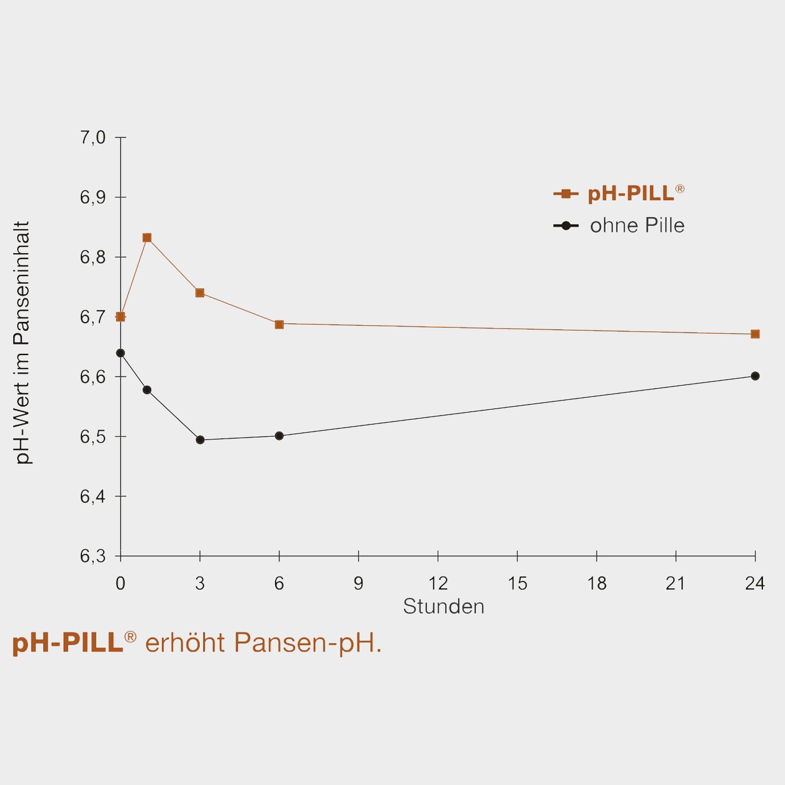 Des apports trop importants de concentrés, dus à des rations mal adaptées, conduisent rapidement à une acidification insidieuse du rumen (acidose du rumen) chez les vaches. Cela peut avoir de graves conséquences sur la santé du bétail. pH-Pill est la première pilule de bicarbonate contre l'acidification du rumen. La préparation à base de bicarbonate de sodium augmente efficacement le pH du rumen et réduit le risque de troubles métaboliques, de fourbure ou de boiterie. Vous pouvez reconnaître une acidification de la panse à une faible teneur en matière grasse du lait, moins de 3% chez plus de 5% des vaches au contrôle laitier mensuel indique une acidification du rumen. Un pH bas (< 5,5) dans le jus de rumen indique également une acidification du rumen.