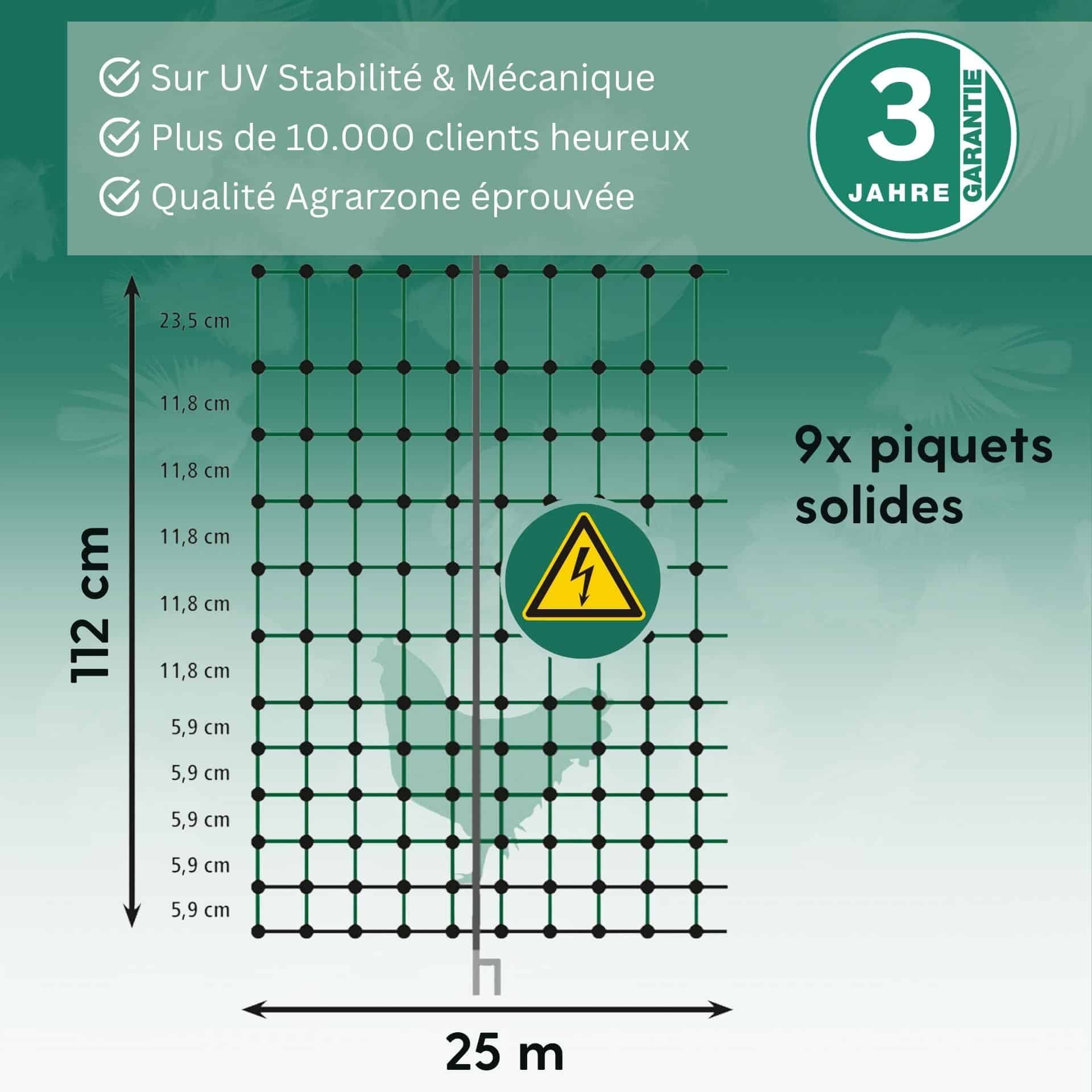 Filet pour poules Agrarzone Classic électrifié, double pointe, vert 25 m x 112 cm