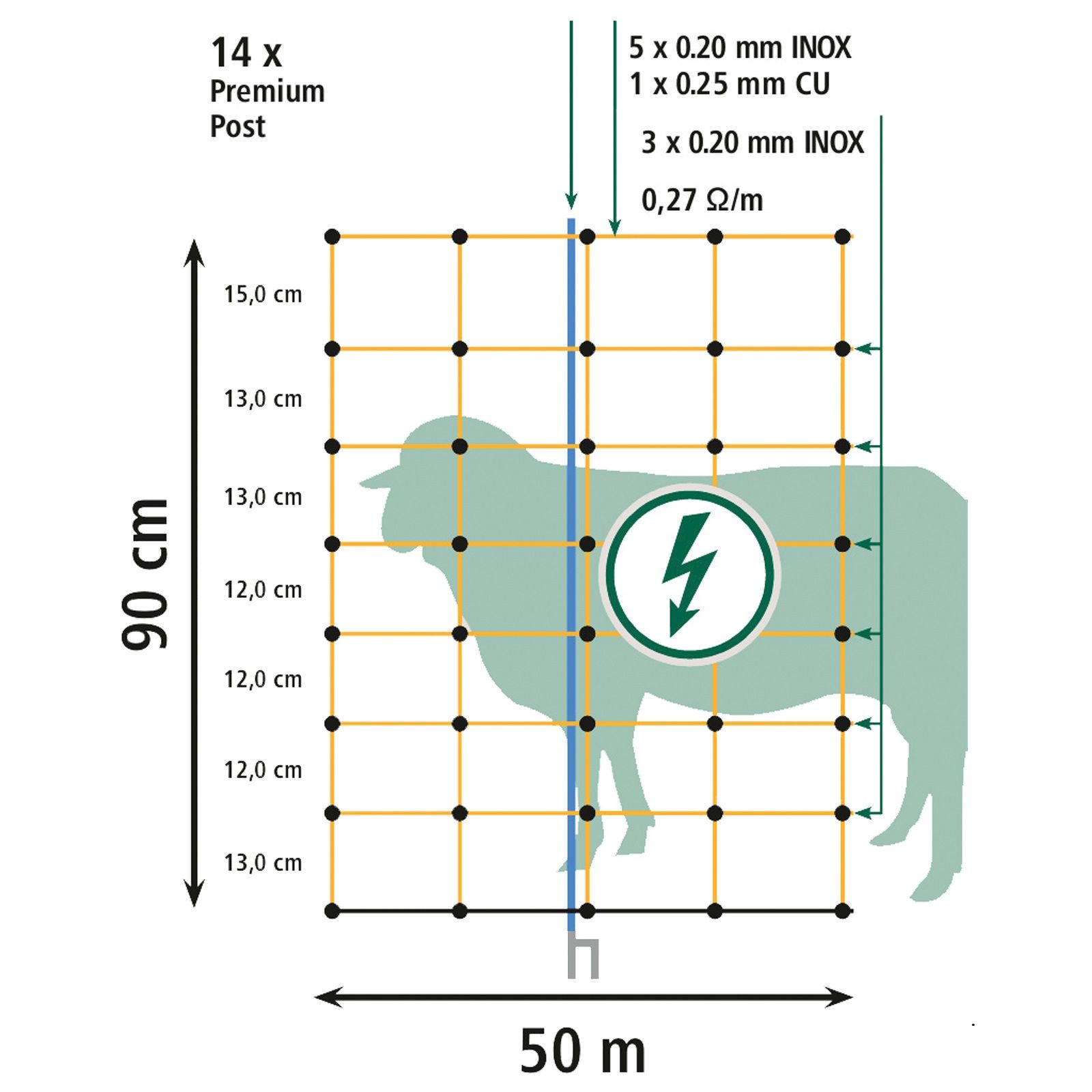 - 50 mètres avec des piquets à double pointe disponibles en deux hauteurs: 90 ou 108 cm.