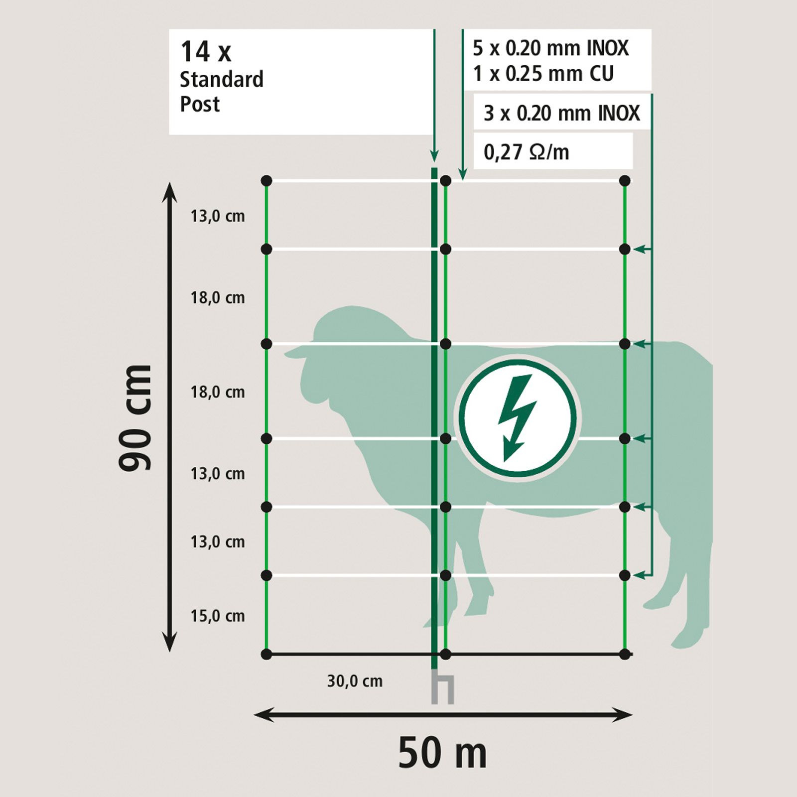 14 piquets en plastique stables avec pointe de fond galvanisée maintiennent fermement le filet dans le sol et l'empêchent de s'affaisser. Ils contiennent eux-mêmes chacun un isolateur de tête et une butée de sol pour fixer le fil. Le fil supérieur renforcé et conducteur de courant garantit une conductivité élevée et une protection efficace du troupeau grâce à l'utilisation de 5 conducteurs en acier inoxydable et d'un conducteur en cuivre étamé. Un plomb en plastique, soudé de manière indissociable à chaque point de croisement des mailles, assure également les bonnes propriétés de protection. Grâce à des clips pratiques en acier inoxydable, il est possible de placer plusieurs filets pour moutons l'un derrière l'autre et de les relier facilement entre eux.