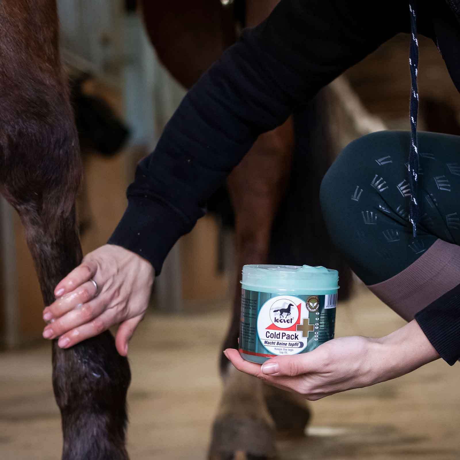 La crème musculaire pour chevaux Leovet Cold Pack, appliquée après le travail ou l'entraînement, est un véritable plaisir pour les muscles fatigués. A base d'arnica, de menthol et de romarin, le Cold Pack de Leovet a un effet biphasique immédiat sur les parties traitées. Après application, une intense sensation de fraîcheur et de revitalisation se répand, suivie d'une agréable chaleur qui détend les muscles. La pommade pour chevaux de Leovet est particulièrement adaptée au traitement des membres, favorise la circulation et améliore l'état du cheval. D'utilisation polyvalente, il convient aussi bien aux chevaux qu'aux cavaliers.