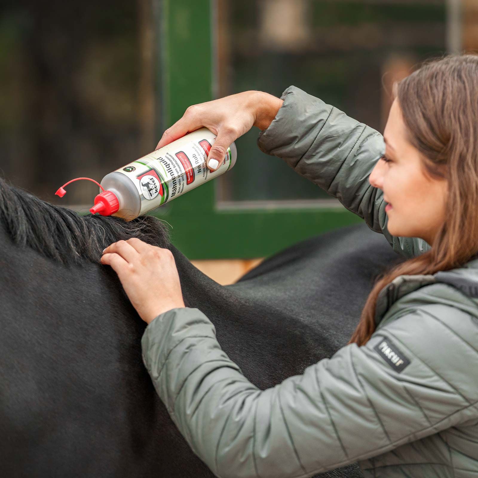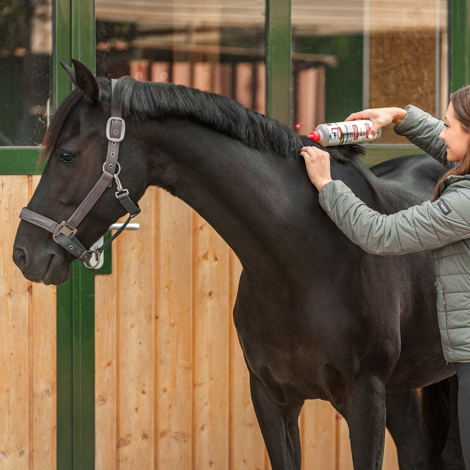 Préparation anti-démangeaisons, combat les pellicules et réduit les frottements de la queue et de la crinière.