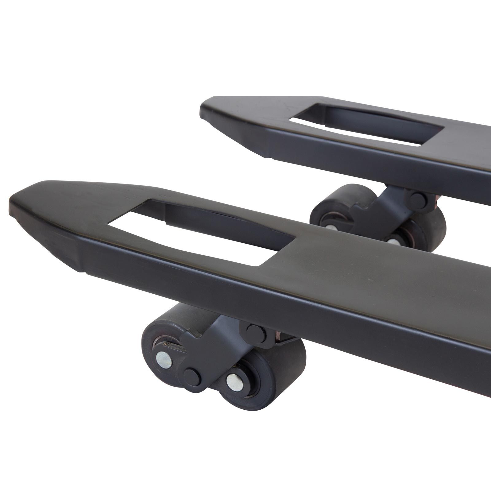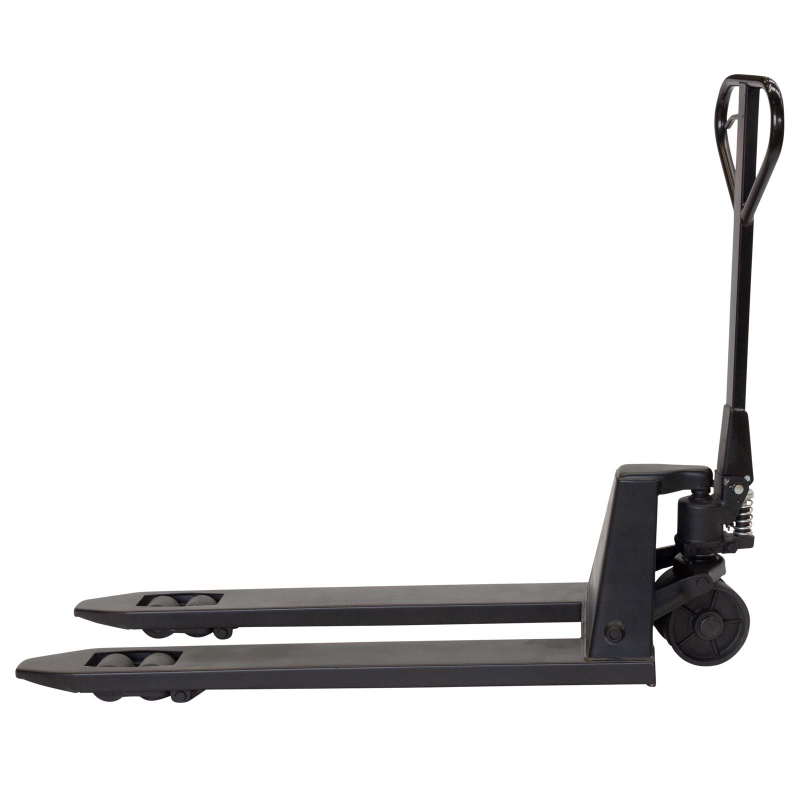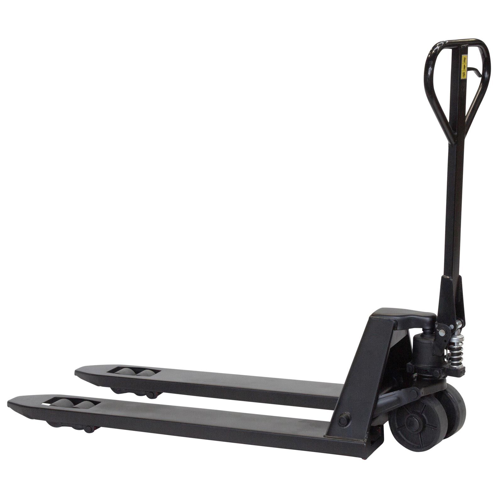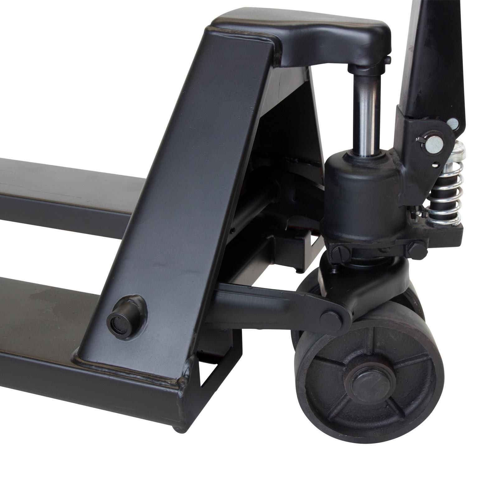 Le bloc de butée robuste et les rouleaux à l'extrémité des fourches permettent une entrée facile sur les palettes. La poignée ergonomique permet de soulever, de conduire et d'abaisser les marchandises confortablement et facilement. La vitesse d'abaissement peut être contrôlée avec précision et sensibilité à l'aide du levier manuel. Les roues en caoutchouc et les roulettes tandem en polyuréthane assurent une réduction massive du bruit lors du transport.