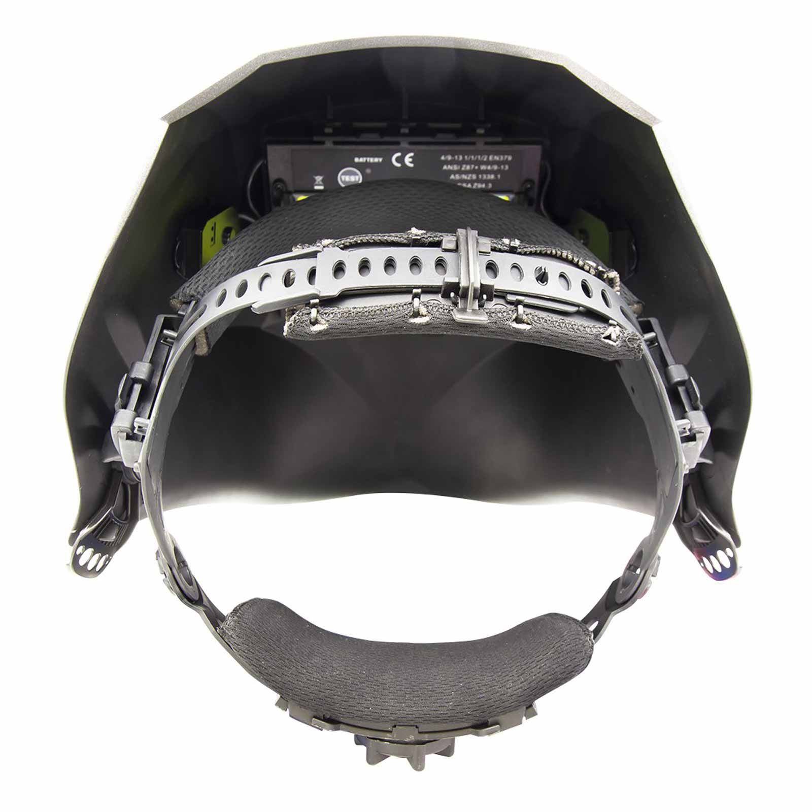 Le niveau de luminosité du grand champ de vision (98 x 55 cm) permet un processus de soudage continu avec le casque fermé. De la mise en place et de l'allumage de l'électrode jusqu'au contrôle de la soudure, lors du changement d'électrode et de la manipulation du matériel, la visière peut rester baissée. Tout 'flashage' accidentel, comme par exemple lors de l'agrafage, est exclu.