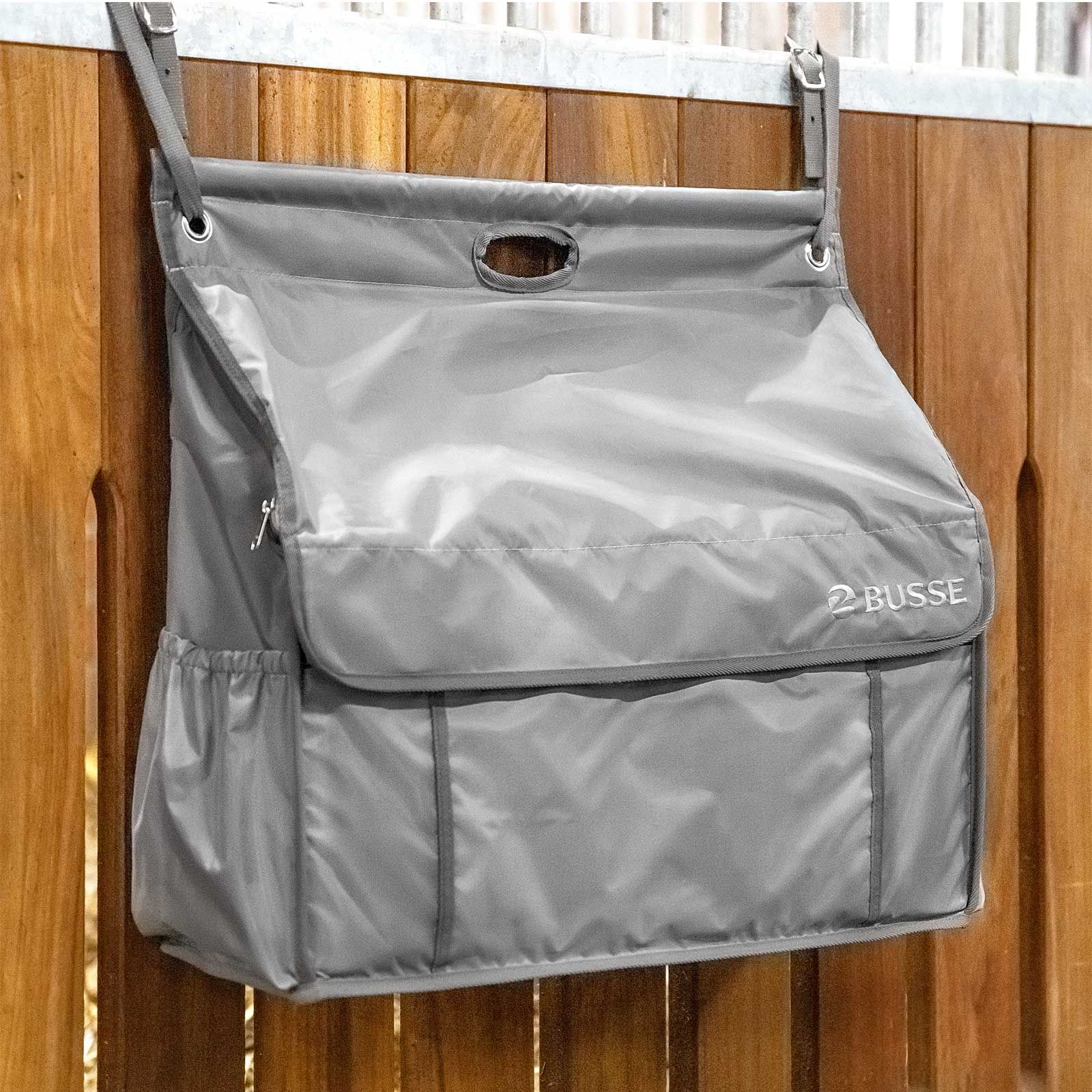 Le sac de box élégant est un sac suspendu très stable en soi pour un rangement propre et ordonné de nombreux accessoires dans l'écurie. Couvertures, bandages, guêtres, cloches, matériel de pansage, sprays, crèmes et autres peuvent être rangés de manière pratique dans ce sac de box. Le sac de box peut être fixé de manière flexible, rapide et sans laisser de traces à l'aide de sangles, par exemple aux barreaux de la façade du box. Pour éviter que la poussière ne pénètre dans le sac, la couverture anti-salissures peut être fermée à l'aide de fermetures éclair et de Velcro. Le sac de box Busse possède un intérieur spacieux avec des parois renforcées, une séparation réglable et un compartiment de rangement. Des compartiments extérieurs pratiques offrent un espace de rangement supplémentaire pour les petits accessoires.