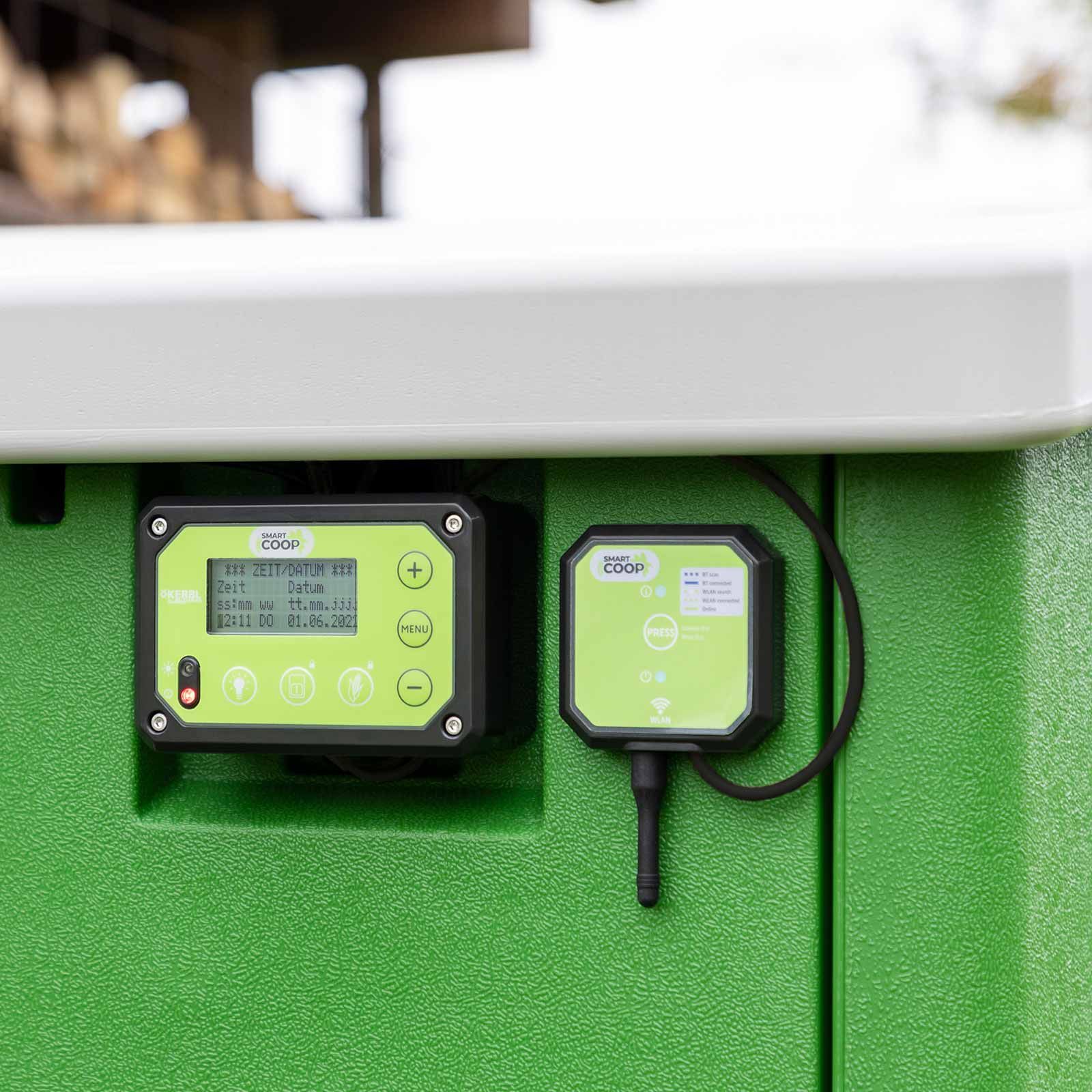 Le module de connectivité disponible en option permet une programmation aisée via une application. Cela permet de contrôler facilement les différents modules SmartCoop et de les adapter rapidement à l'évolution des besoins. Des accessoires disponibles séparément, tels que l'éclairage du poulailler, le capteur de température, le capteur externe de lumière du jour, la ventilation du poulailler, le chauffage de l'abreuvoir et bien d'autres encore, permettent d'adapter le système SmartCoop à vos exigences et à vos besoins individuels.