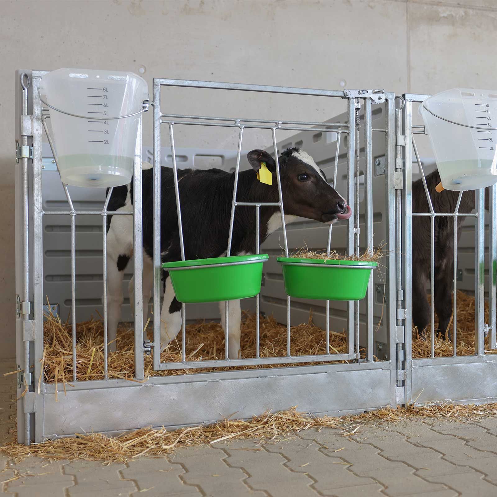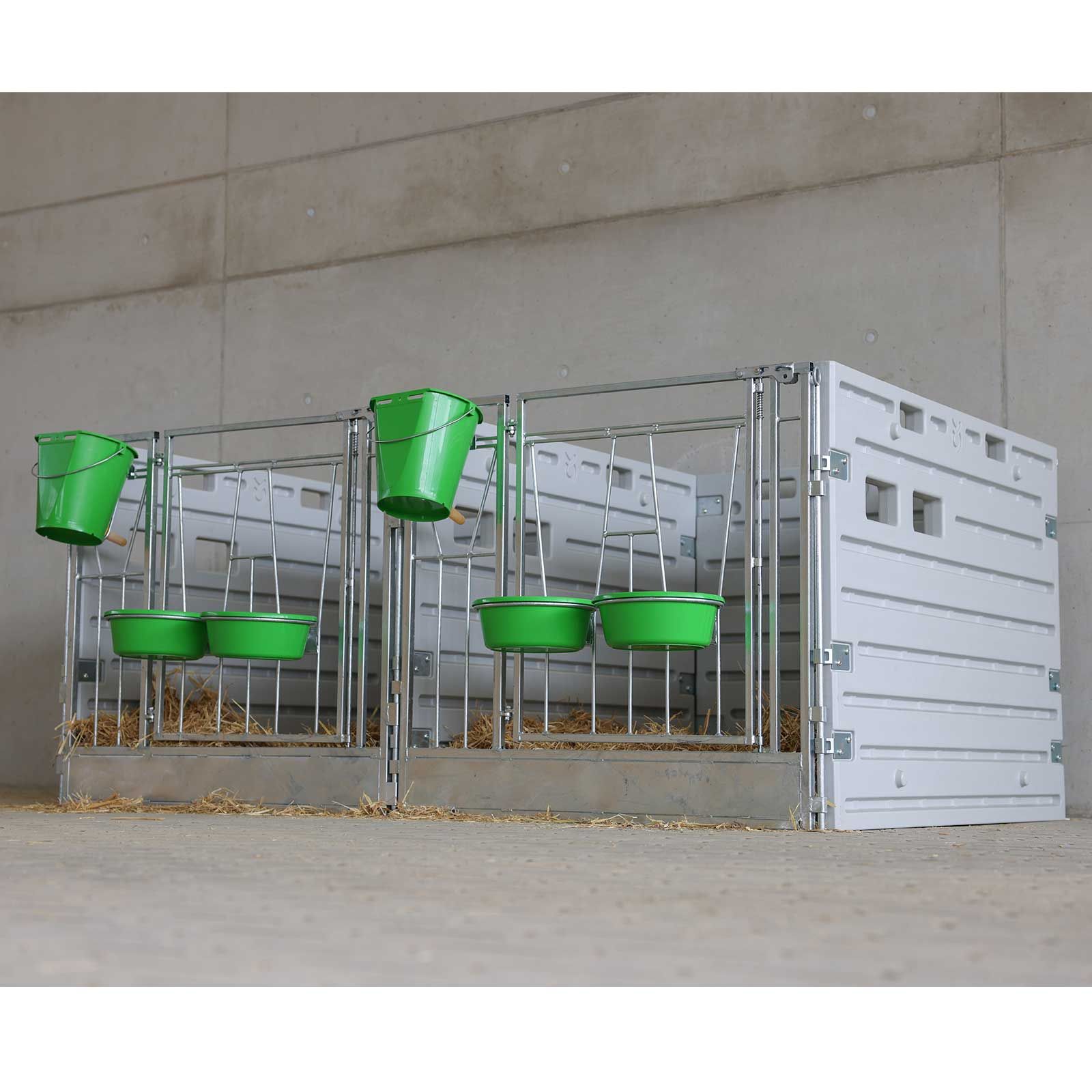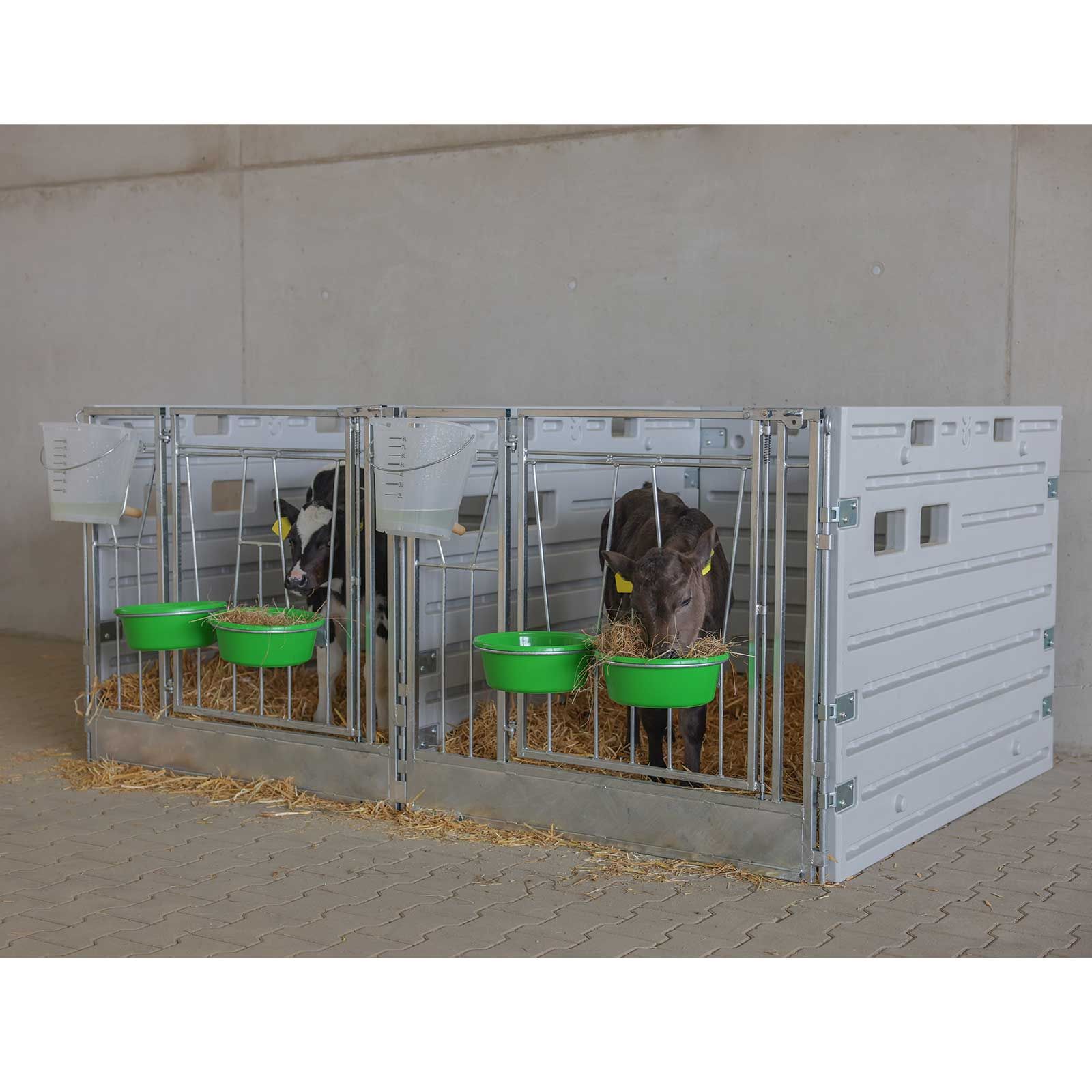Les parois latérales du box double pour veaux sont équipées d'une ouverture de contact social qui permet au veau d'entrer en contact avec d'autres veaux. L'élément frontal dispose d'une porte pivotante et d'une zone d'abreuvement fixe, idéale pour apprendre aux veaux à utiliser les tétines. Les boxes à veaux sont également équipés d'un support de seau d'abreuvement et de deux supports de seau rabattables.