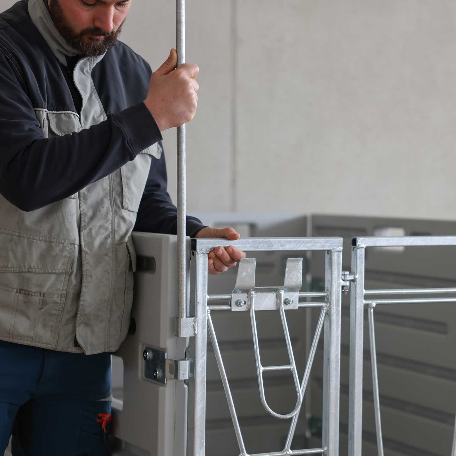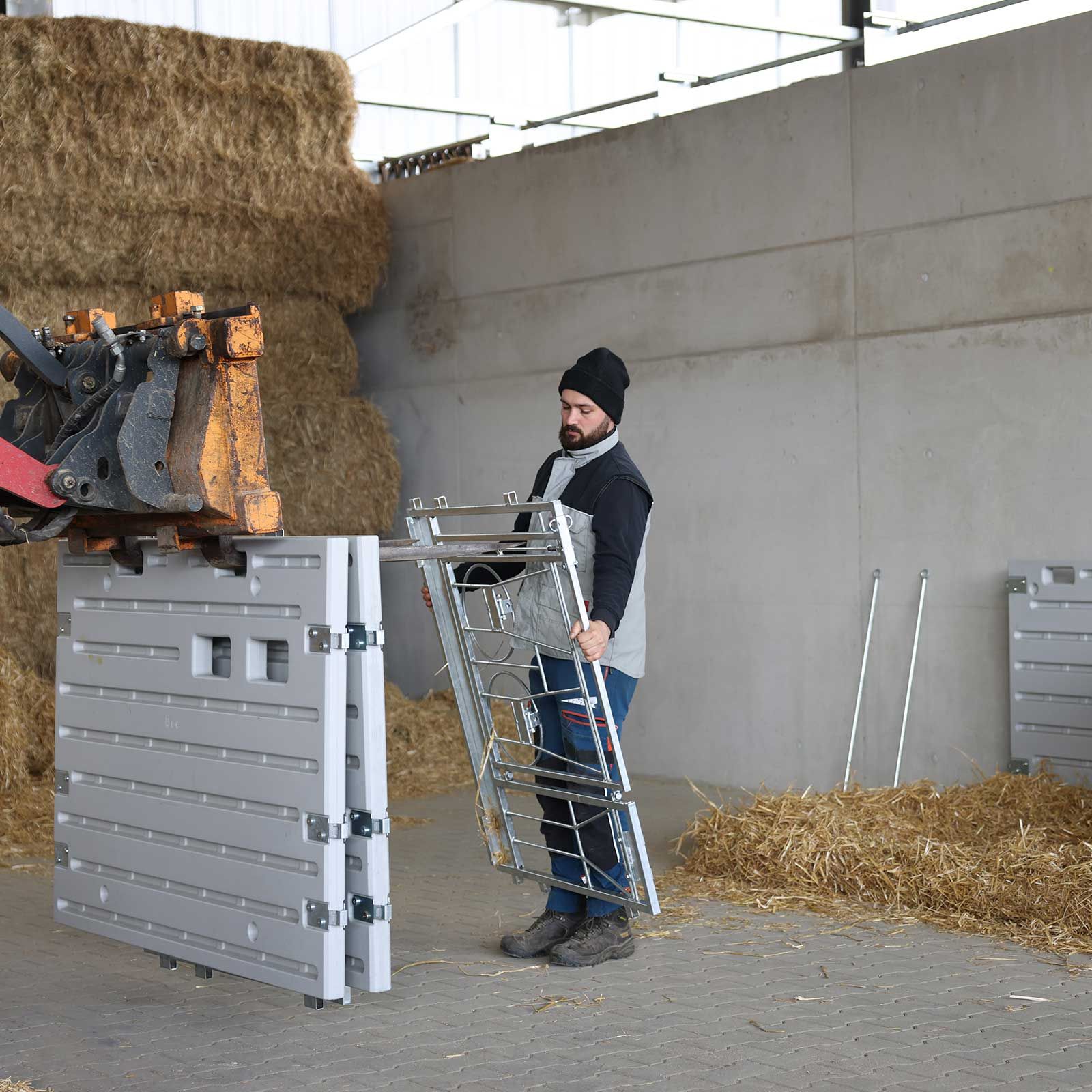 Le montage et le démontage du box à veaux double modulaire sont aussi simples que rapides. Les poignées sur les panneaux sont suffisamment grandes pour permettre de les aligner sur une fourche à palette. Le système d'empilage unique permet de trier et de stocker les panneaux, y compris l'élément de porte, en économisant de la place.