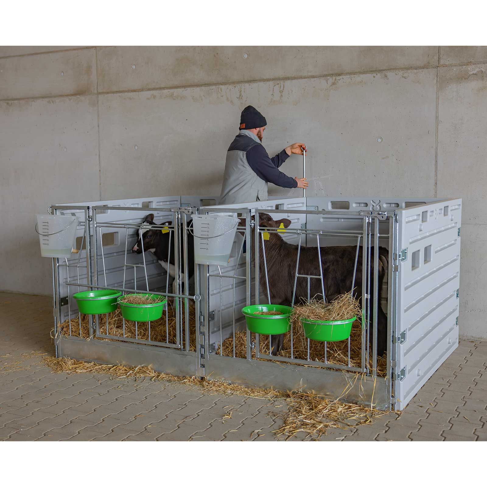 Les cases à veaux modulaires de Kerbl offrent une flexibilité et une économie de travail maximales. Avec une surface d'environ 1,8 mètres carrés (1,60 x 1,15 m) par box, ils offrent suffisamment de place pour un élevage individuel de chaque veau.