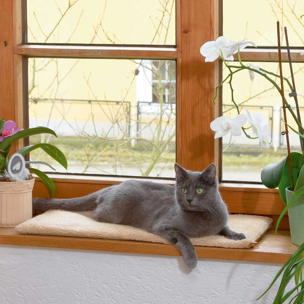 Cette super surface de couchage auto-chauffante reflète la chaleur corporelle du chat et repousse le froid du rebord de la fenêtre.