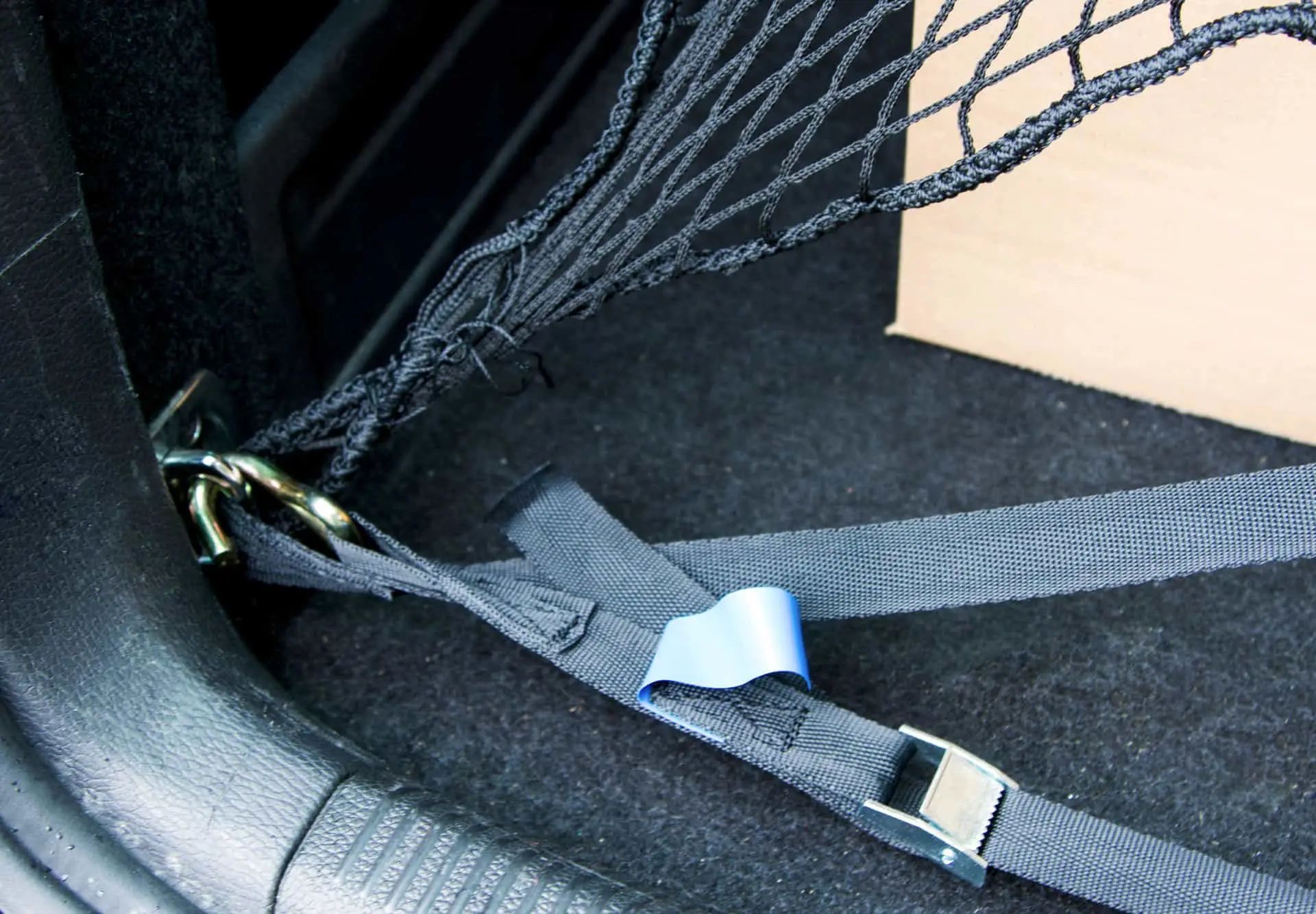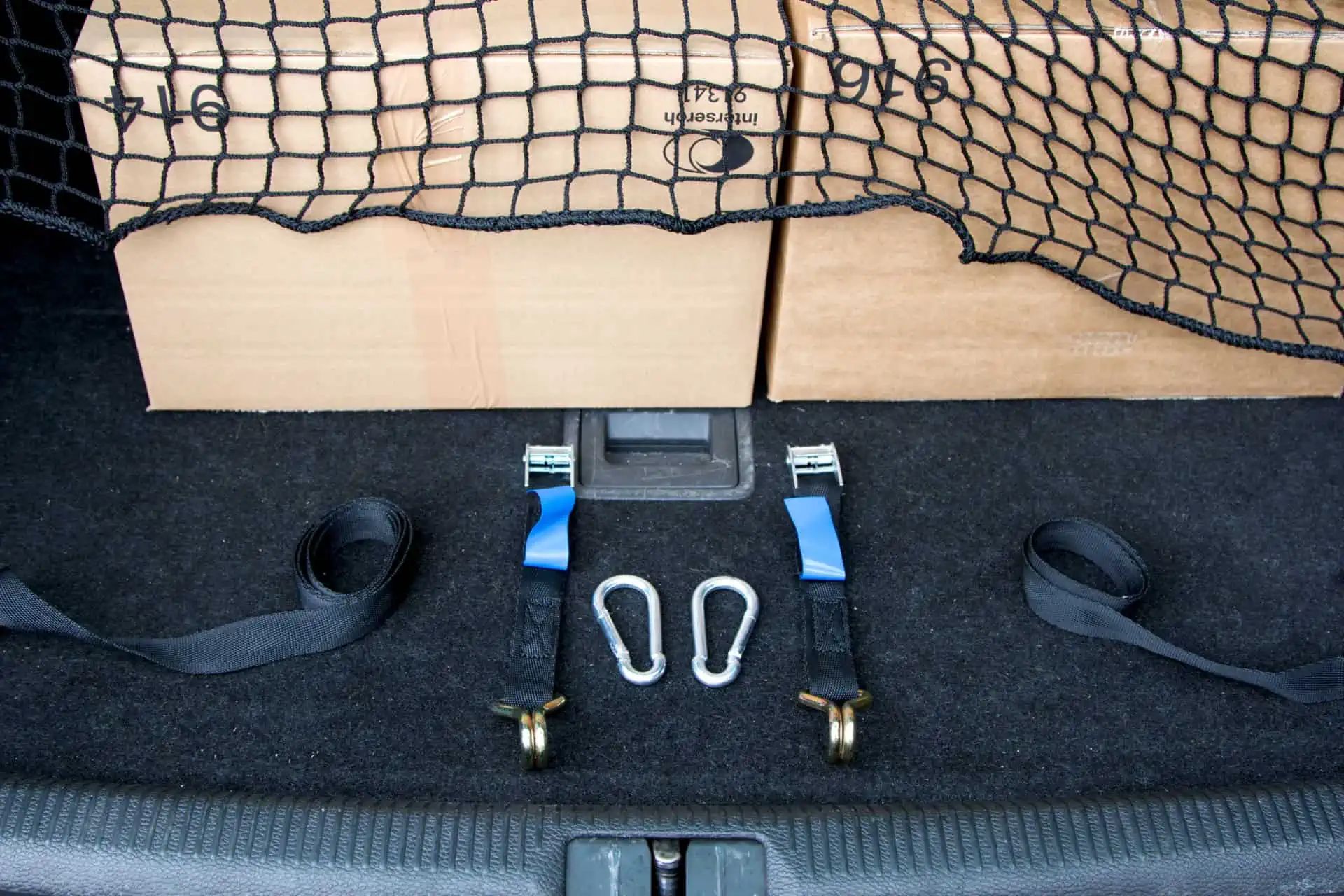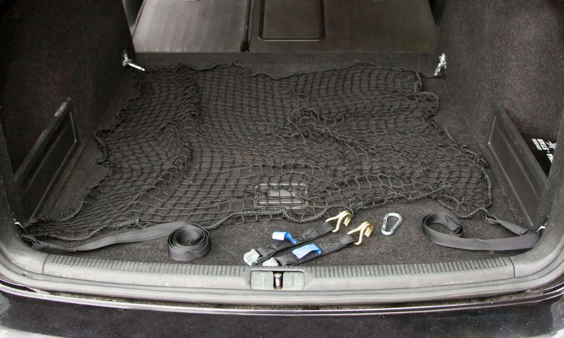 - Supplied package includes 2 spring hooks and 2 straps: One belt end is secured to the PES elastic straps on the net, while the other belt end is secured using claw hooks to the anchor points in the car