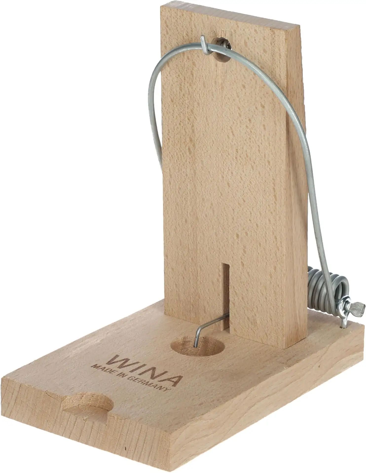 Ce piège est doté d'un corps massif en deux parties fait de bois de hêtre certifié PEFC™. Il comporte une armature et un ressort double face en fil d'acier galvanisé pour une efficacité élevée et durable, même lors d'une utilisation multiple en extérieur. De plus, il dispose d'un crochet en fil d'acier galvanisé pour attacher l'appât, garantissant ainsi une résistance aux éléments atmosphériques.