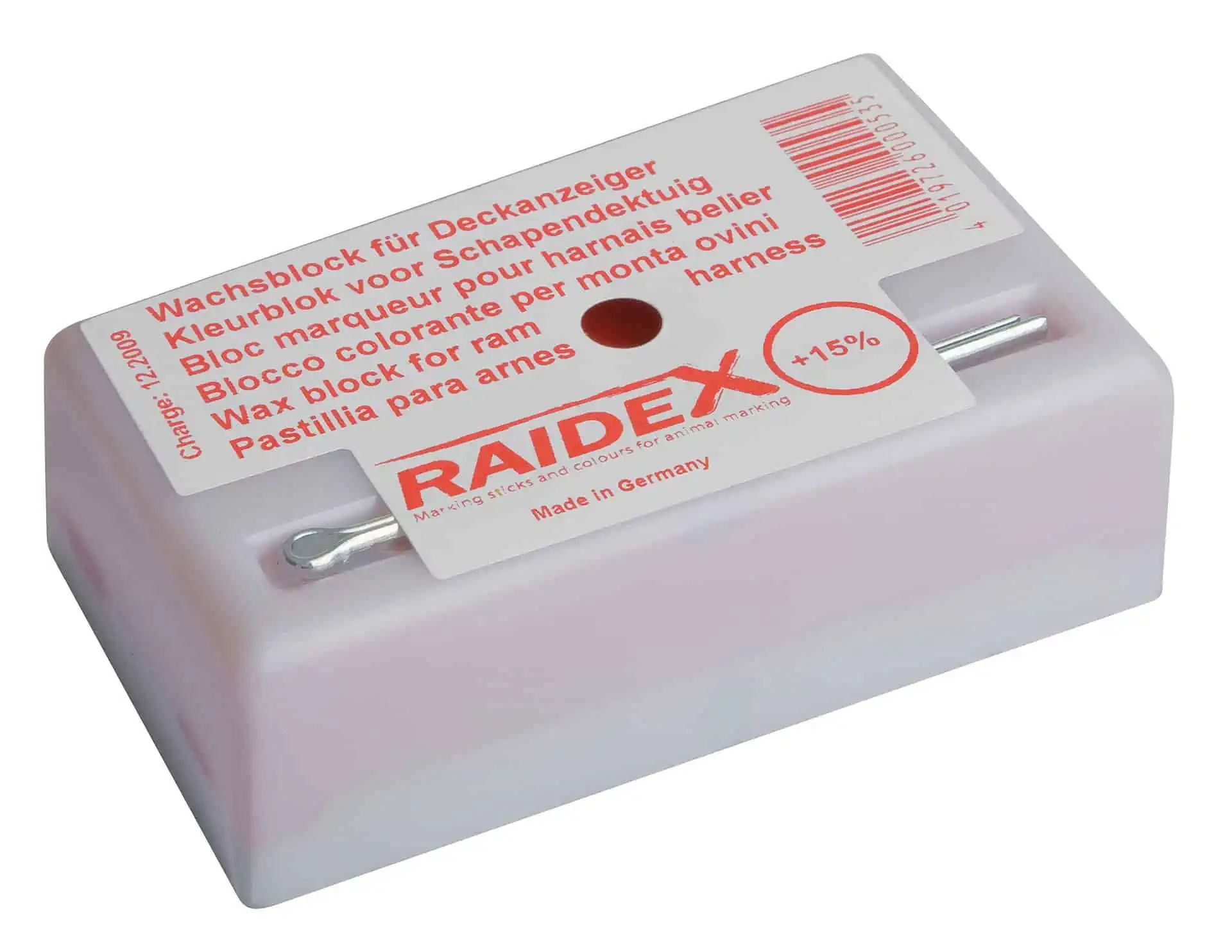 Le bloc de couleur Raidex est un outil essentiel pour l'élevage des ovins. Il est fixé au bélier dans le bloc de cire et le bélier laisse ainsi une marque claire sur le dos de la brebis lorsqu'il saute. vous pouvez ainsi déterminer avec précision le moment de l'agnelage.