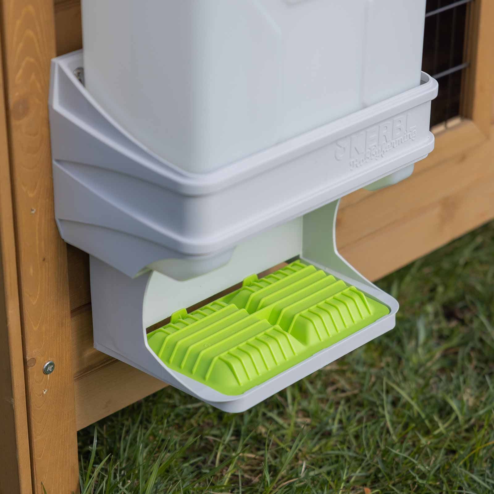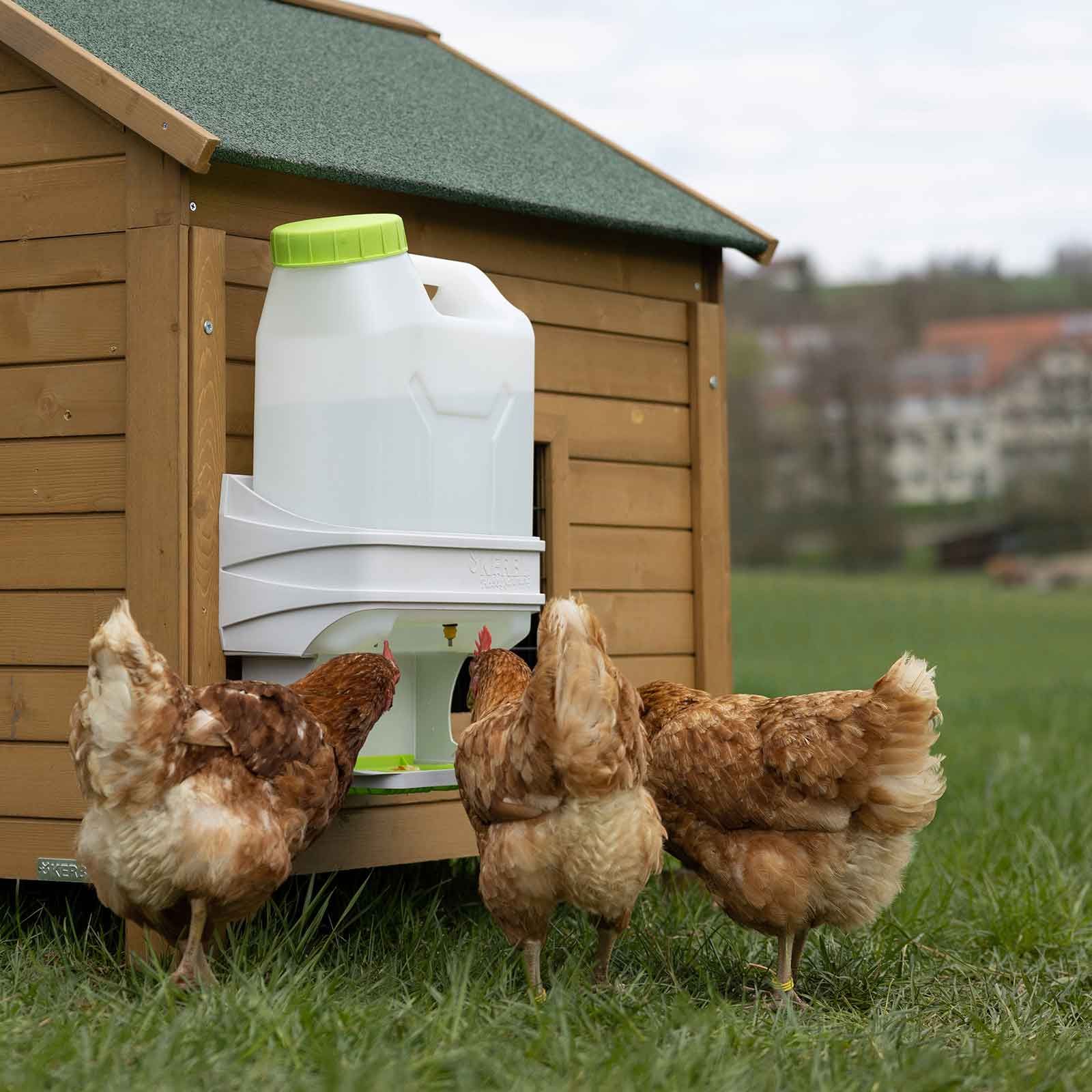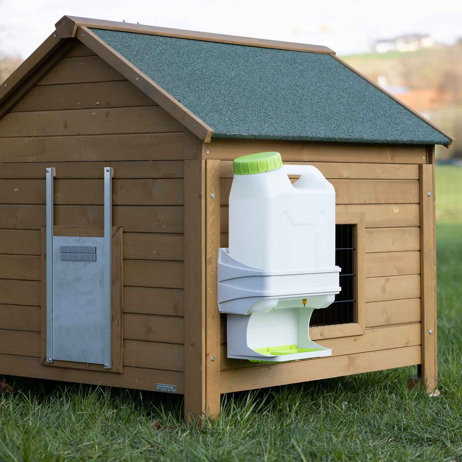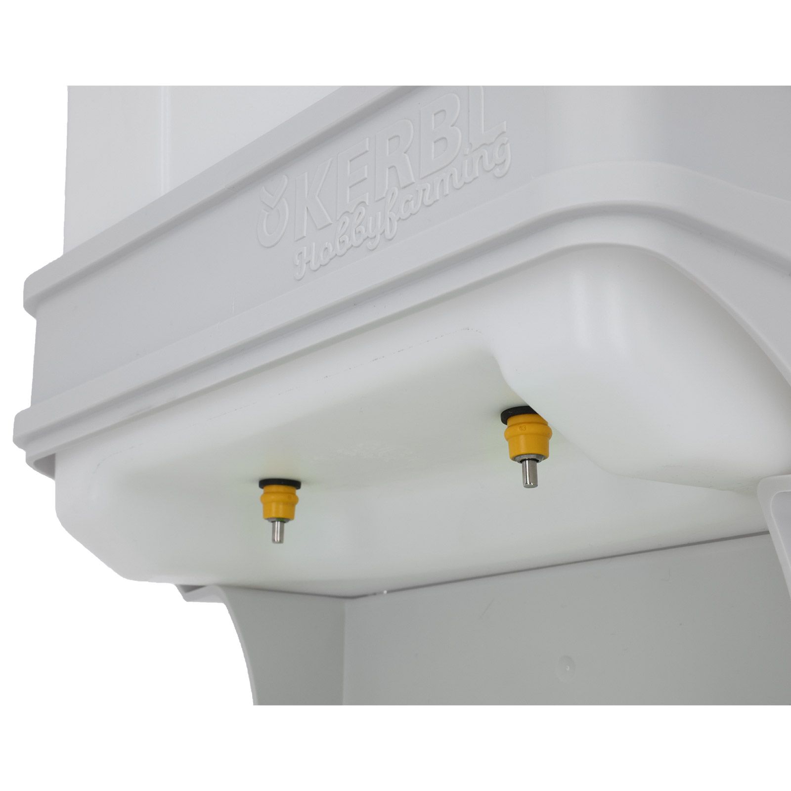 Le couvercle enfichable, non fileté et étanche empêche les acariens de s'installer, tandis que le support mural permet une installation peu encombrante et sûre. Un bac d'égouttage recueille l'eau en excès et peut même être tourné pour servir de marchepied aux poussins.
