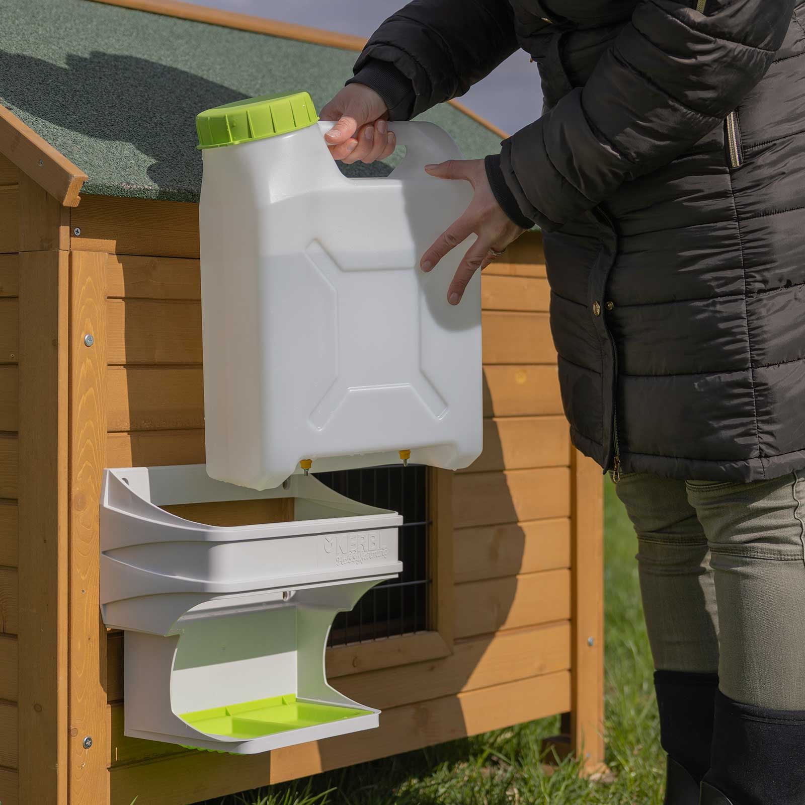 Le récipient robuste en matériau de qualité alimentaire dispose d'une poignée pour une manipulation confortable. L'abreuvoir pour volailles SmartCoop prend peu de place et peut être placé sans problème dans les petits poulaillers. De plus, il est facile à nettoyer, ce qui garantit une utilisation hygiénique.