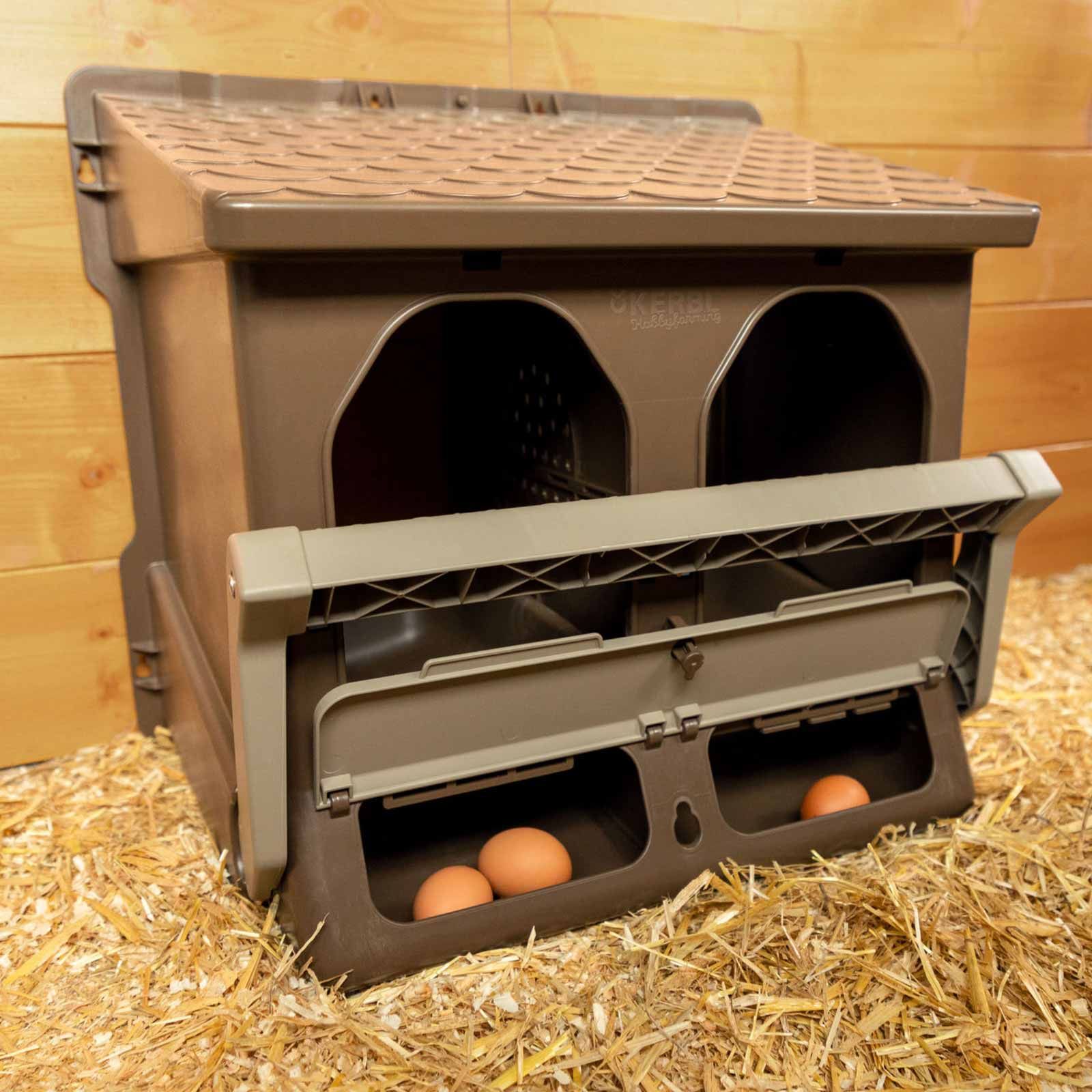 Grâce à une cloison intérieure, le nid est divisé en deux compartiments de nidification. Le double nid de ponte dispose d'un réservoir d'œufs de grande capacité pouvant contenir jusqu'à 10 œufs par compartiment de nid. La porte d'inspection verrouillable vous permet de contrôler facilement les œufs, tandis que le fond incliné permet de les retirer sans effort.