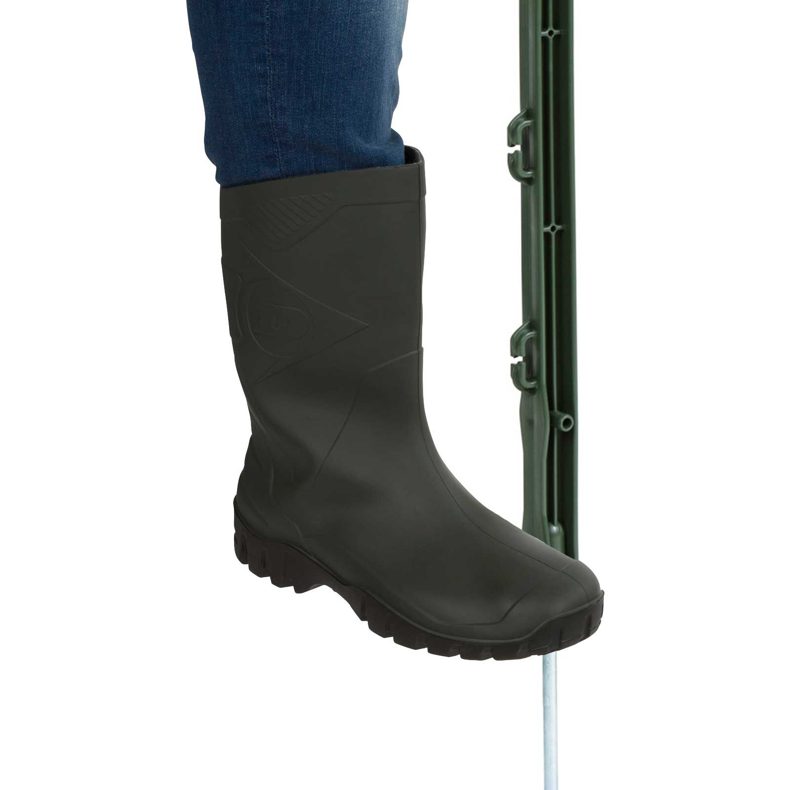 Le piquet en plastique avec marche-pied unique et protection anti-torsion est en outre équipé d'un pointe de sol galvanisé de 18 cm qui lui confère une grande stabilité. Les 5 œillets sur le piquet de clôture permettent de fixer des rubans (jusqu'à 2 cm) ou des cordes afin de garantir une clôture fiable.