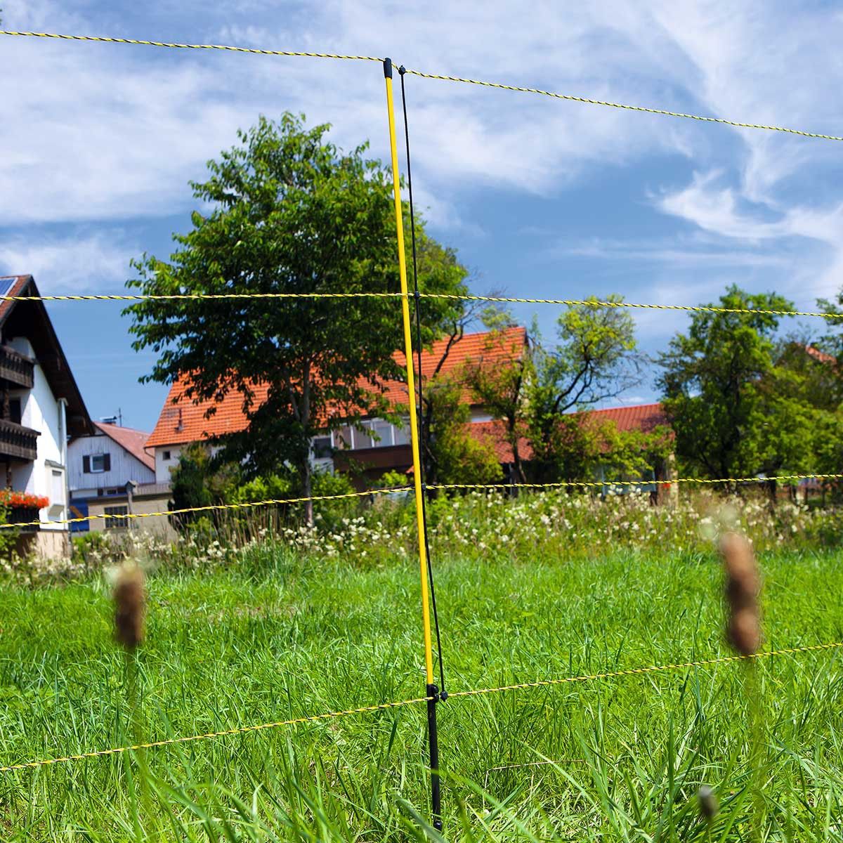 LeFilet à mouton EasyNet avec une garde au sol, vous pouvez montage et démontage rapide. Surtout le très léger mais énorme des poteaux en fibre de verre robustes et durables avec une bande de roulement et un clou en acier simplifier considérablement le travail. La distance au sol permet et facilite le fauchage (ou les animaux mangent généralement eux-mêmes l'herbe sous le filet) et réduit ainsi énormément la dissipation de puissance par la croissance de l'herbe sur le filet. Cela augmente considérablement l'effet de choc. Des tests de terrain approfondis l'ont confirmé de manière impressionnante. Par rapport aux filets conventionnels, où le fil de terre peut facilement s'enfoncer dans le filet, le filet à moutons EasyNet peut être facilement déplacé en raison de la distance au sol.
