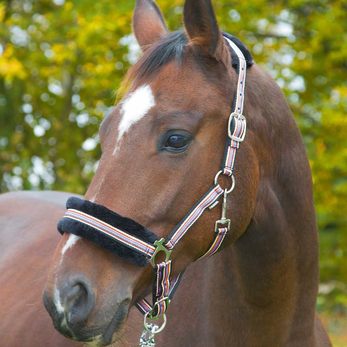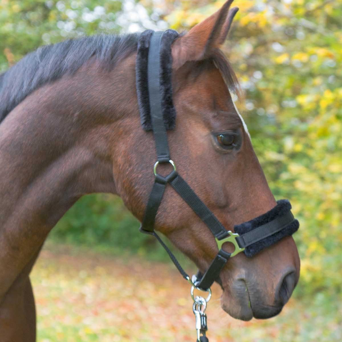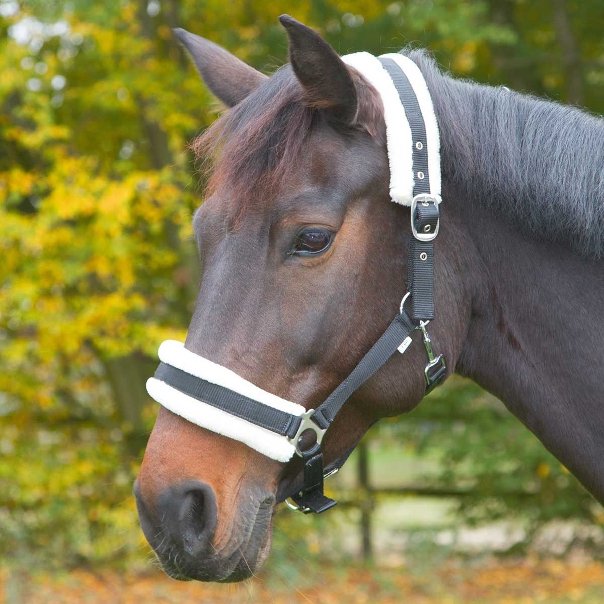 Ce licol est idéal pour les chevaux sensibles et possède un rembourrage en fourrure tissée remplaçable en noir et blanc.