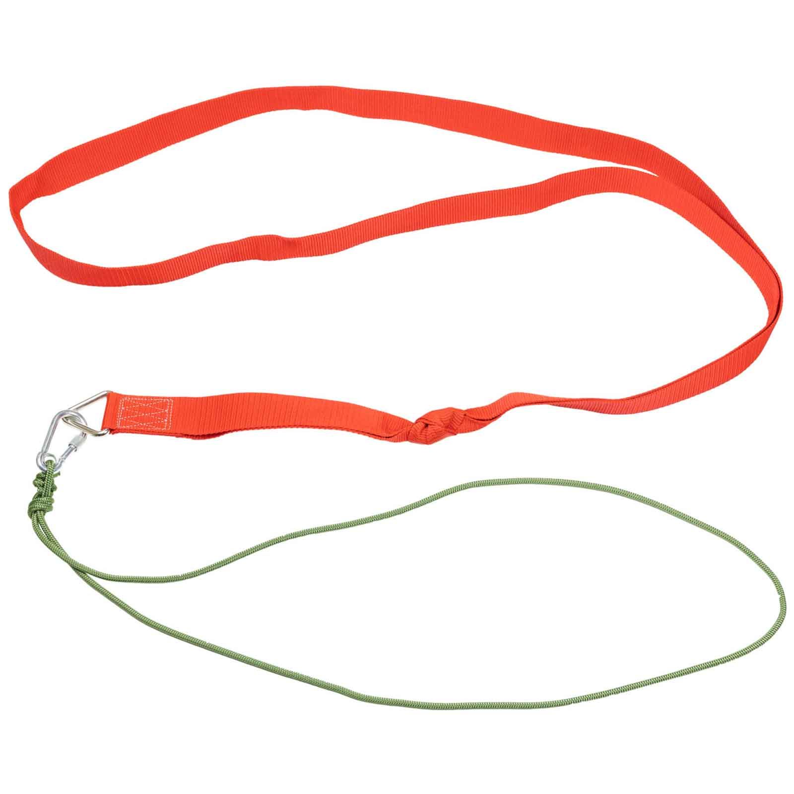 Porte gibier avec sangle d'épaule de 40 mm de large. Un anneau D en acier inoxydable de 6 mm cousu, en combinaison avec un mousqueton en acier inoxydable où un morceau de corde est intégré, en fait un outil polyvalent. Pour la récupération, la sangle est placée autour du porteur. La capacité de charge du système de harnais est de plus de 500 kg.