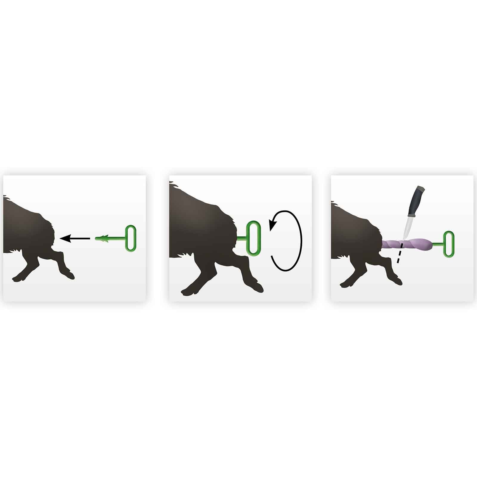 Le déclenchement du crochet à abats par l'anneau offre une meilleure qualité de viande de gibier et assure une meilleure hygiène. En retirant les entrailles vers la tête, les cuisses ne sont pas contaminées et ne doivent pas être aiguisées.