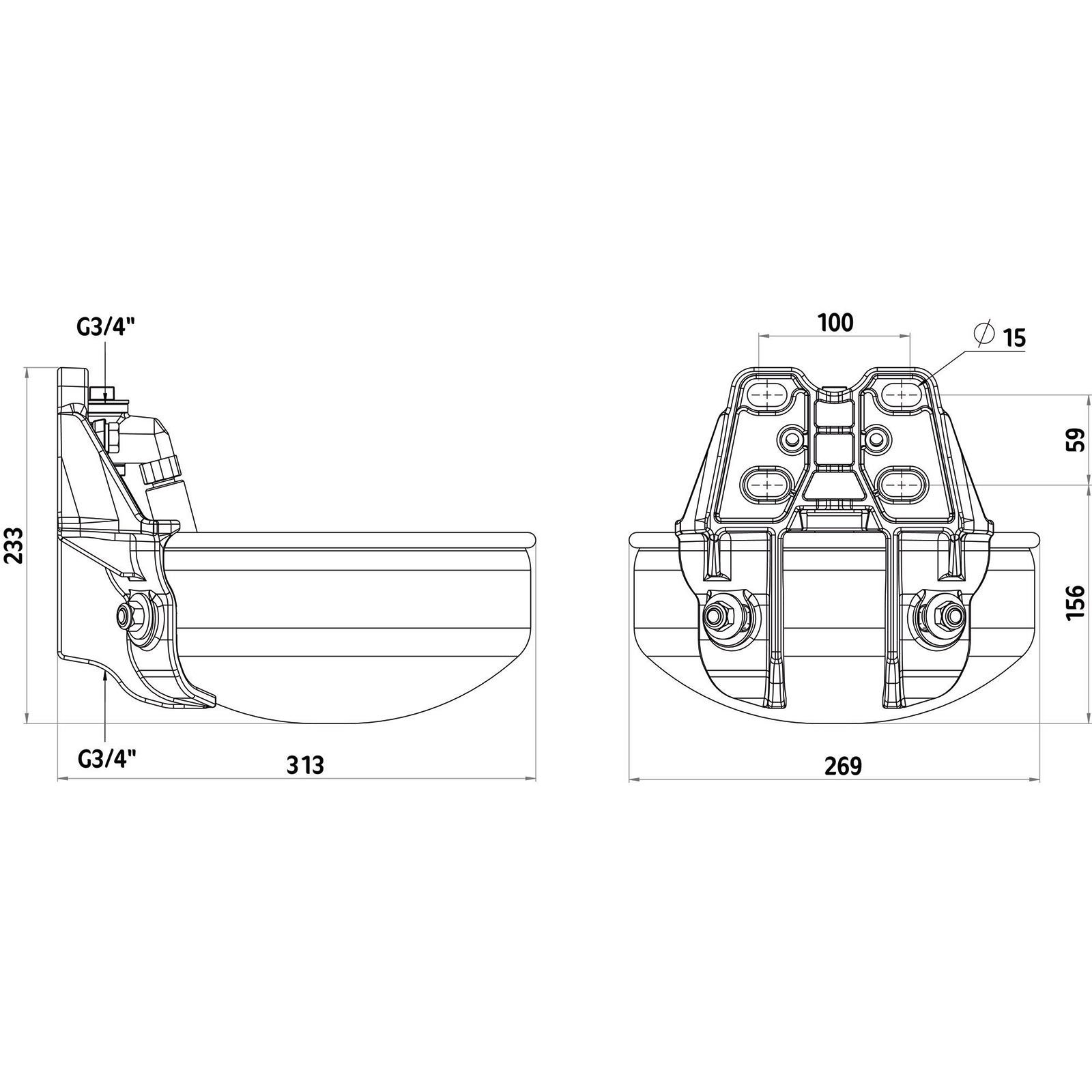Avec le Montage en 4 points l'abreuvoir de la vache et du cheval peut être Montage sur un mur ou un tuyau (matériel de fixation non compris dans le volume de livraison). Le raccordement à l'eau avec le raccord 3/4" est possible par le bas et par le haut.