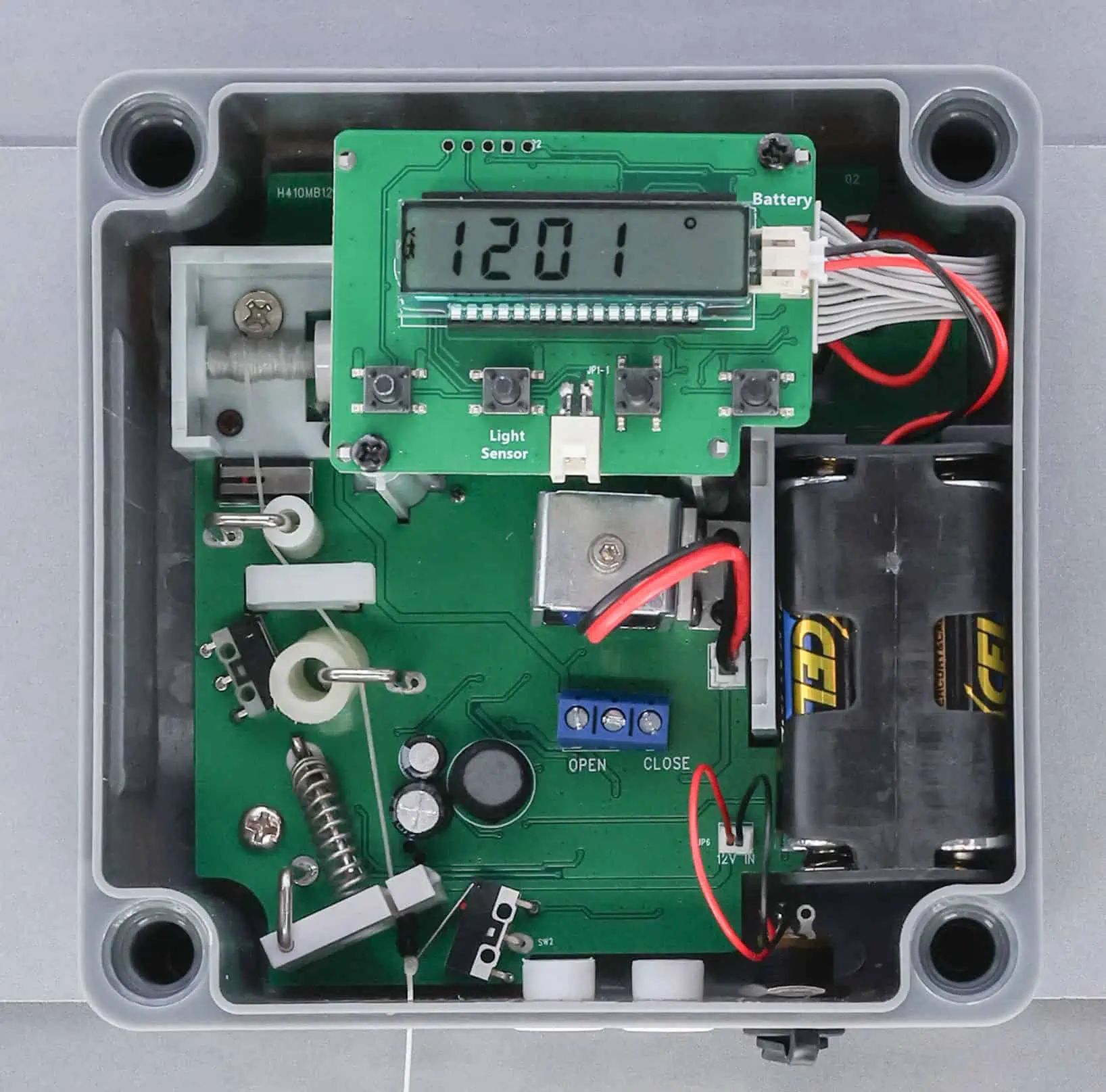La porte automatique pour poulailler EasyProtect peut être alimentée soit par le secteur 230 volts, soit par 4 piles AA Mignon.